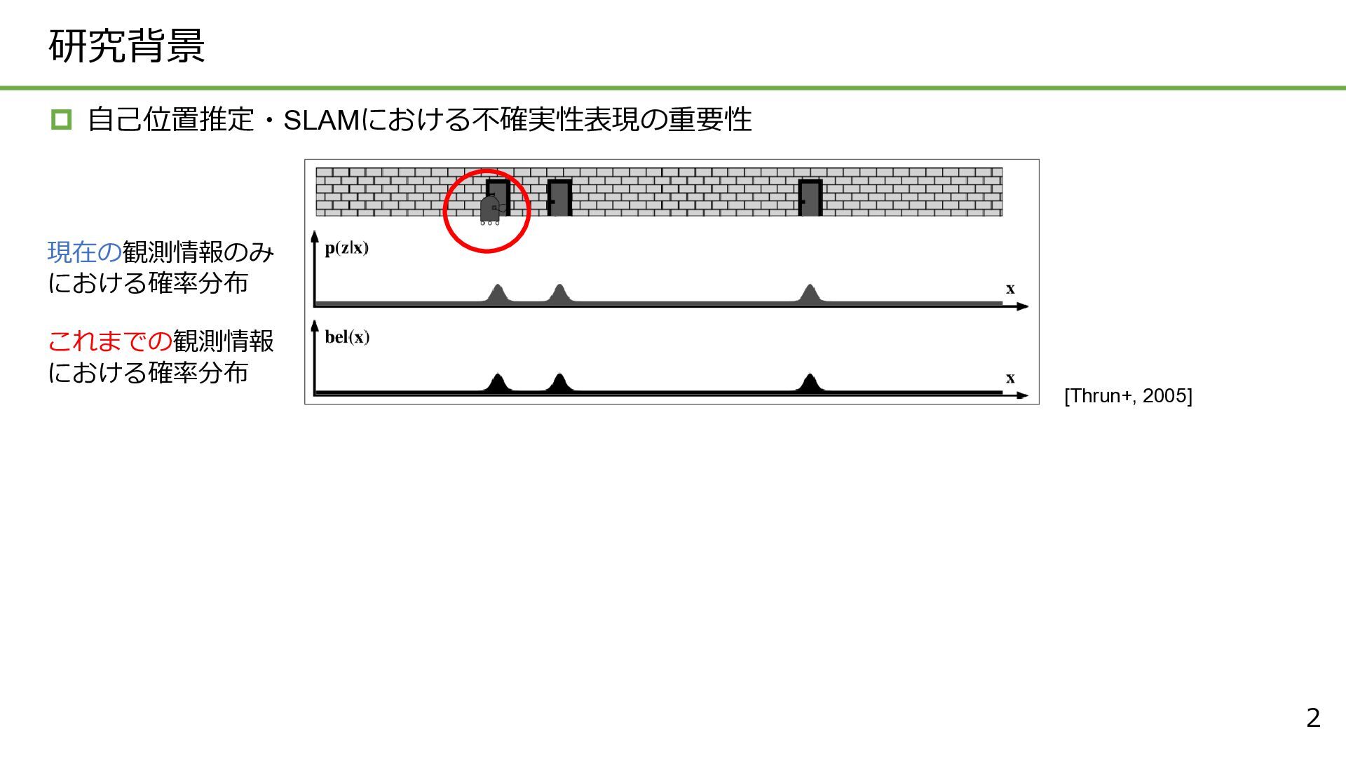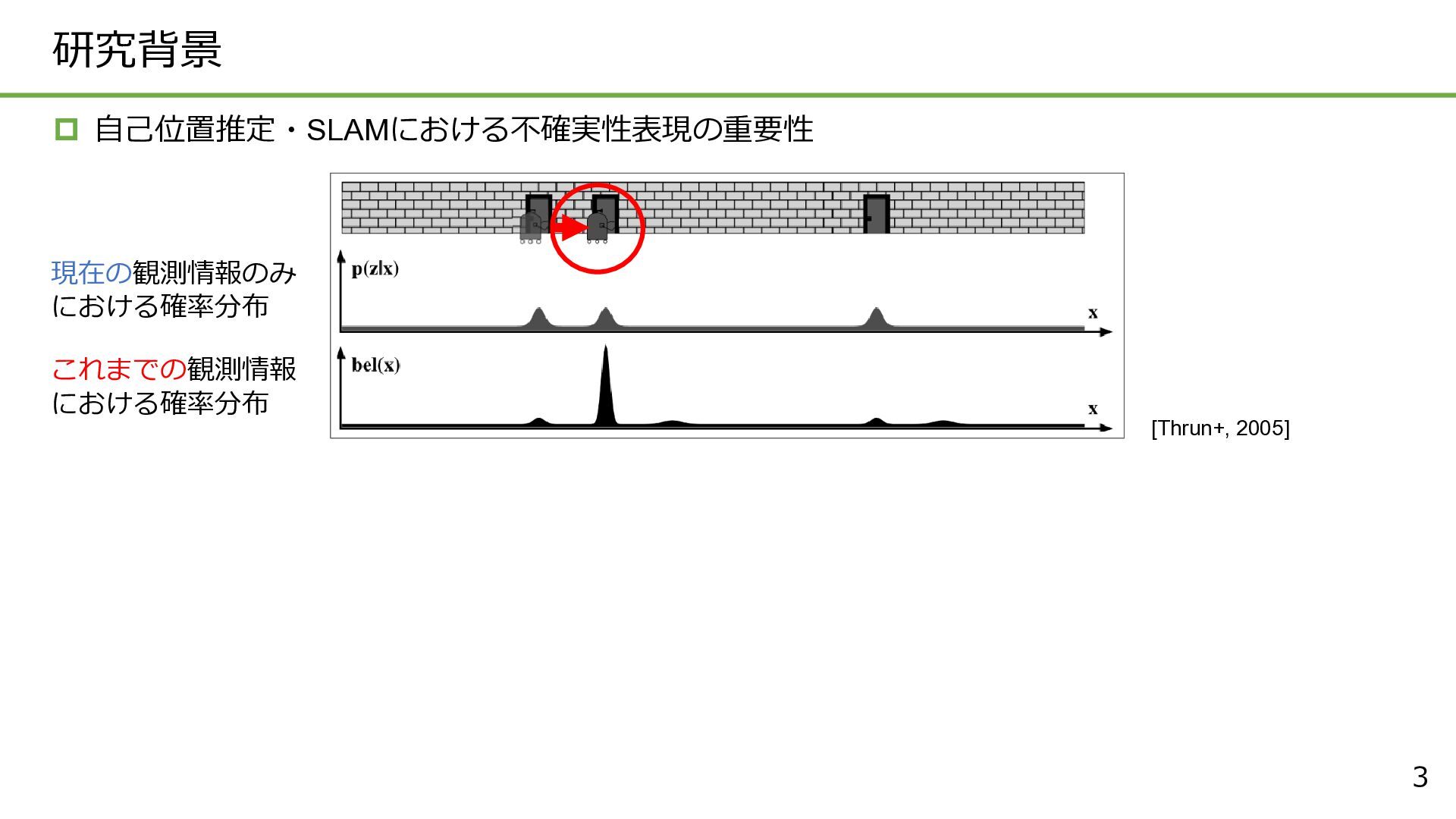 2 研究背景 自己位置推定・SLAMにおける不確実性表現の重要性 [Thrun+, 2005] これまでの観測情報 における確率分布 現在の観測情報のみ における確率分布