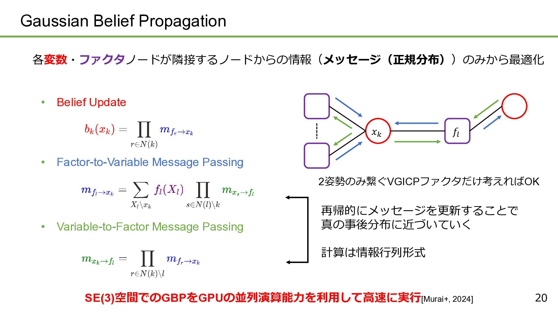 Passing • Variable-to-Factor Message Passing 𝑥𝑘 𝑓𝑙 再帰的にメッセージを更新することで 真の事後分布に近づいていく 計算は情報行列形式 各変数・ファクタノードが隣接するノードからの情報(メッセージ(正規分布))のみから最適化 2姿勢のみ繋ぐVGICPファクタだけ考えればOK SE(3)空間でのGBPをGPUの並列演算能力を利用して高速に実行[Murai+, 2024]