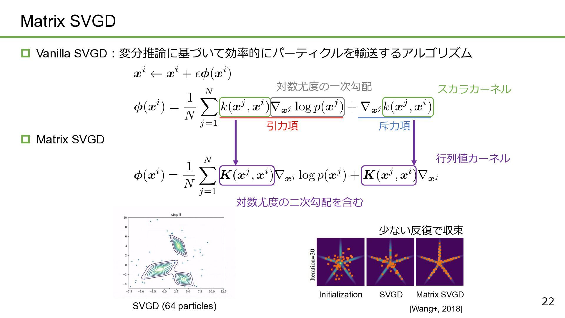 SVGD:変分推論に基づいて効率的にパーティクルを輸送するアルゴリズム 引力項 斥力項 Matrix SVGD Initialization SVGD Matrix SVGD [Wang+, 2018] 少ない反復で収束 行列値カーネル 対数尤度の二次勾配を含む