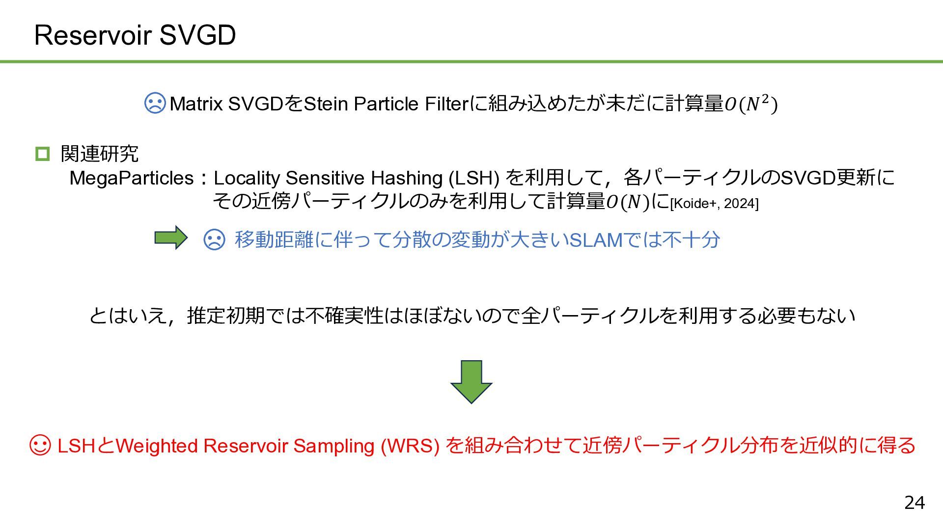 Sensitive Hashing (LSH) を利用して,各パーティクルのSVGD更新に その近傍パーティクルのみを利用して計算量𝑂(𝑁)に[Koide+, 2024] 移動距離に伴って分散の変動が大きいSLAMでは不十分 とはいえ,推定初期では不確実性はほぼないので全パーティクルを利用する必要もない LSHとWeighted Reservoir Sampling (WRS) を組み合わせて近傍パーティクル分布を近似的に得る