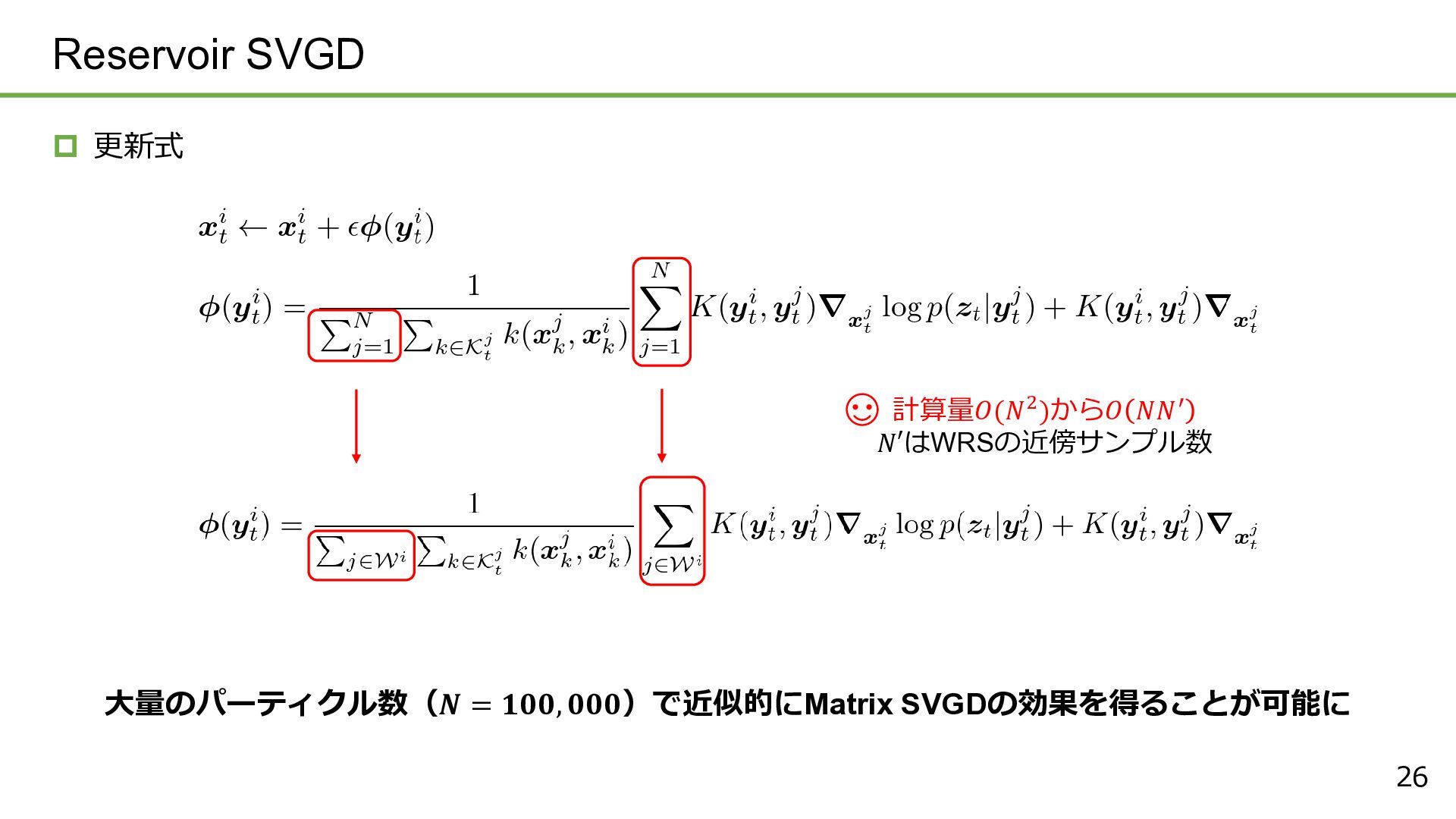 24 Reservoir SVGD Matrix SVGDをStein Particle Filterに組み込めたが未だに計算量𝑂(𝑁2) 関連研究 MegaParticles:Locality