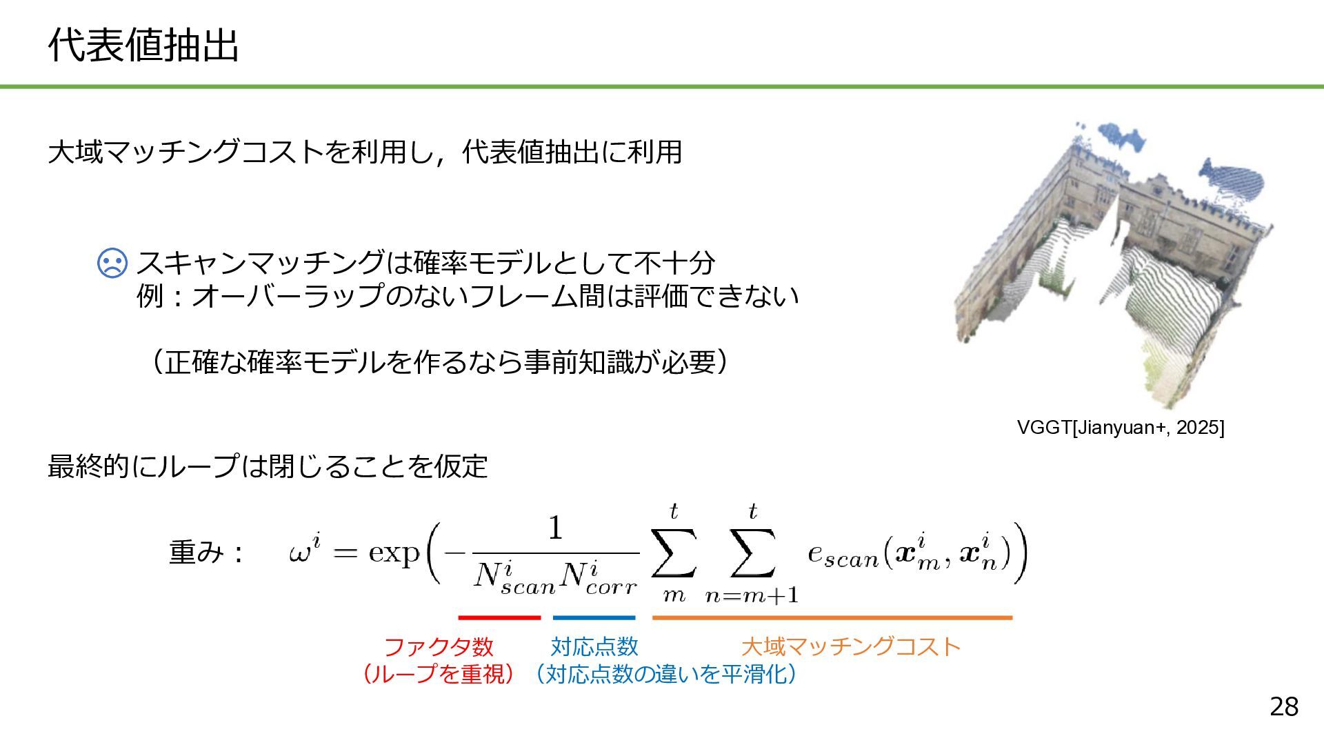 28 代表値抽出 大域マッチングコストを利用し,代表値抽出に利用 VGGT[Jianyuan+, 2025] スキャンマッチングは確率モデルとして不十分 例:オーバーラップのないフレーム間は評価できない (正確な確率モデルを作るなら事前知識が必要) 最終的にループは閉じることを仮定 大域マッチングコスト