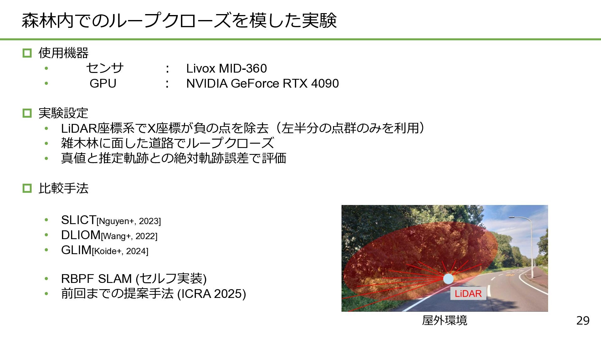 GPU : NVIDIA GeForce RTX 4090 実験設定 • LiDAR座標系でX座標が負の点を除去(左半分の点群のみを利用) • 雑木林に面した道路でループクローズ • 真値と推定軌跡との絶対軌跡誤差で評価 比較手法 • SLICT[Nguyen+, 2023] • DLIOM[Wang+, 2022] • GLIM[Koide+, 2024] • RBPF SLAM (セルフ実装) • 前回までの提案手法 (ICRA 2025) 屋外環境