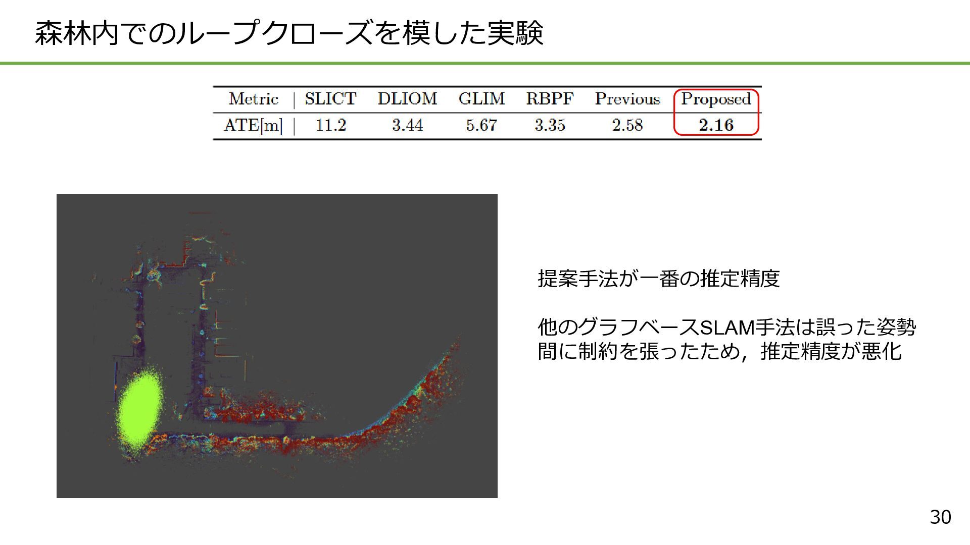 30 森林内でのループクローズを模した実験 提案手法が一番の推定精度 他のグラフベースSLAM手法は誤った姿勢 間に制約を張ったため,推定精度が悪化