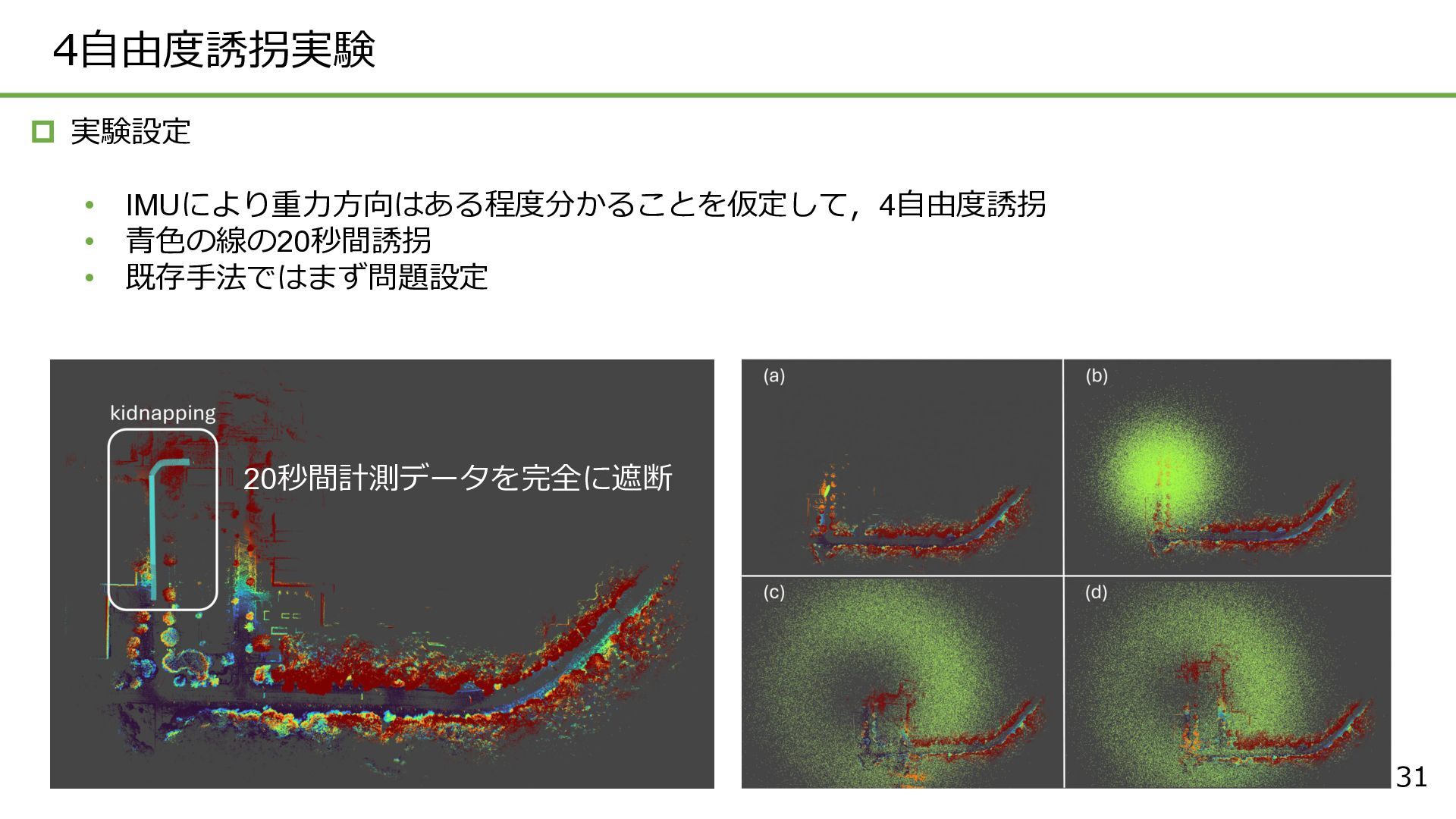 31 4自由度誘拐実験 実験設定 • IMUにより重力方向はある程度分かることを仮定して,4自由度誘拐 • 青色の線の20秒間誘拐 • 既存手法ではまず問題設定