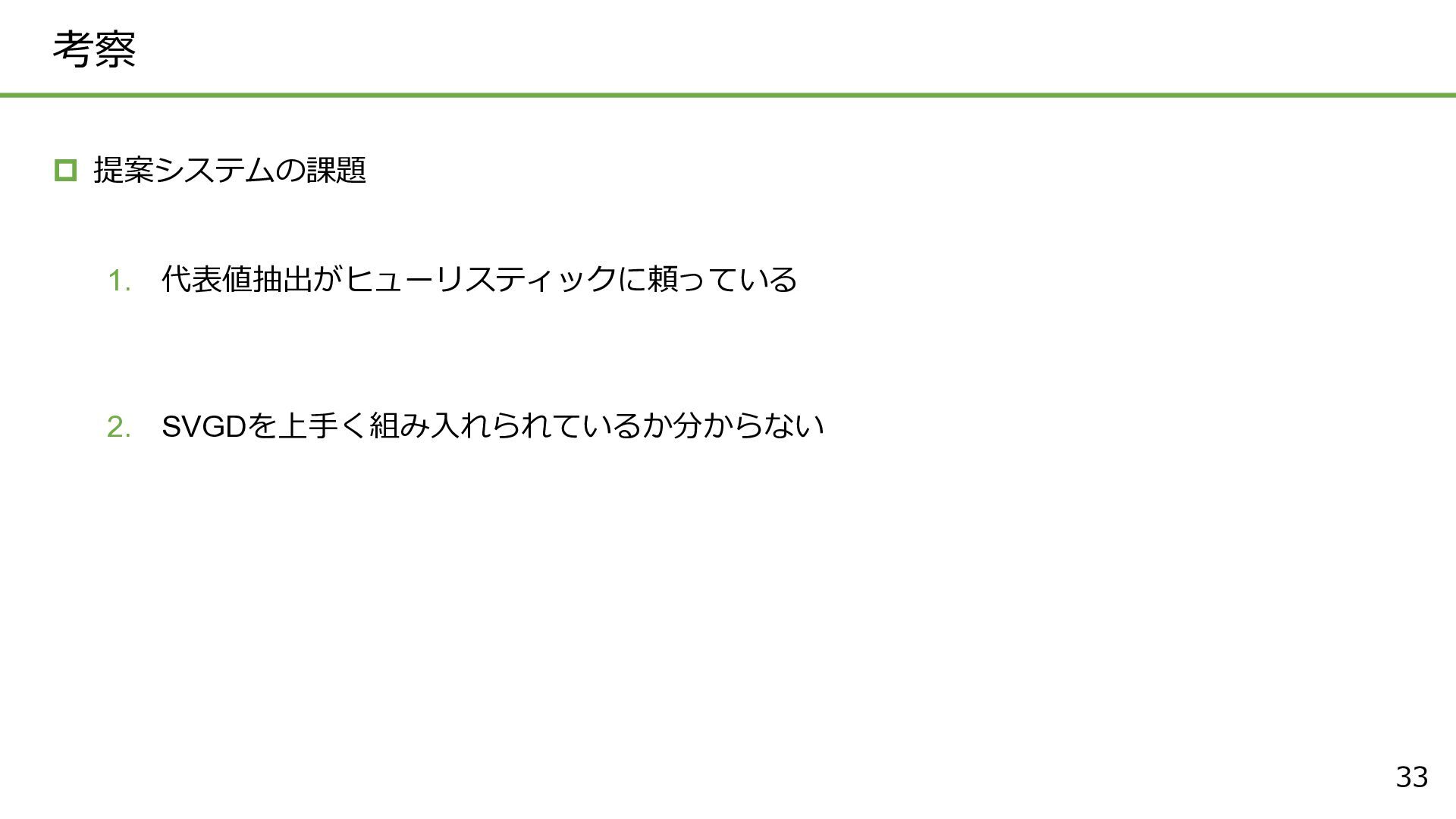 33 考察 提案システムの課題 1. 代表値抽出がヒューリスティックに頼っている 2. SVGDを上手く組み入れられているか分からない