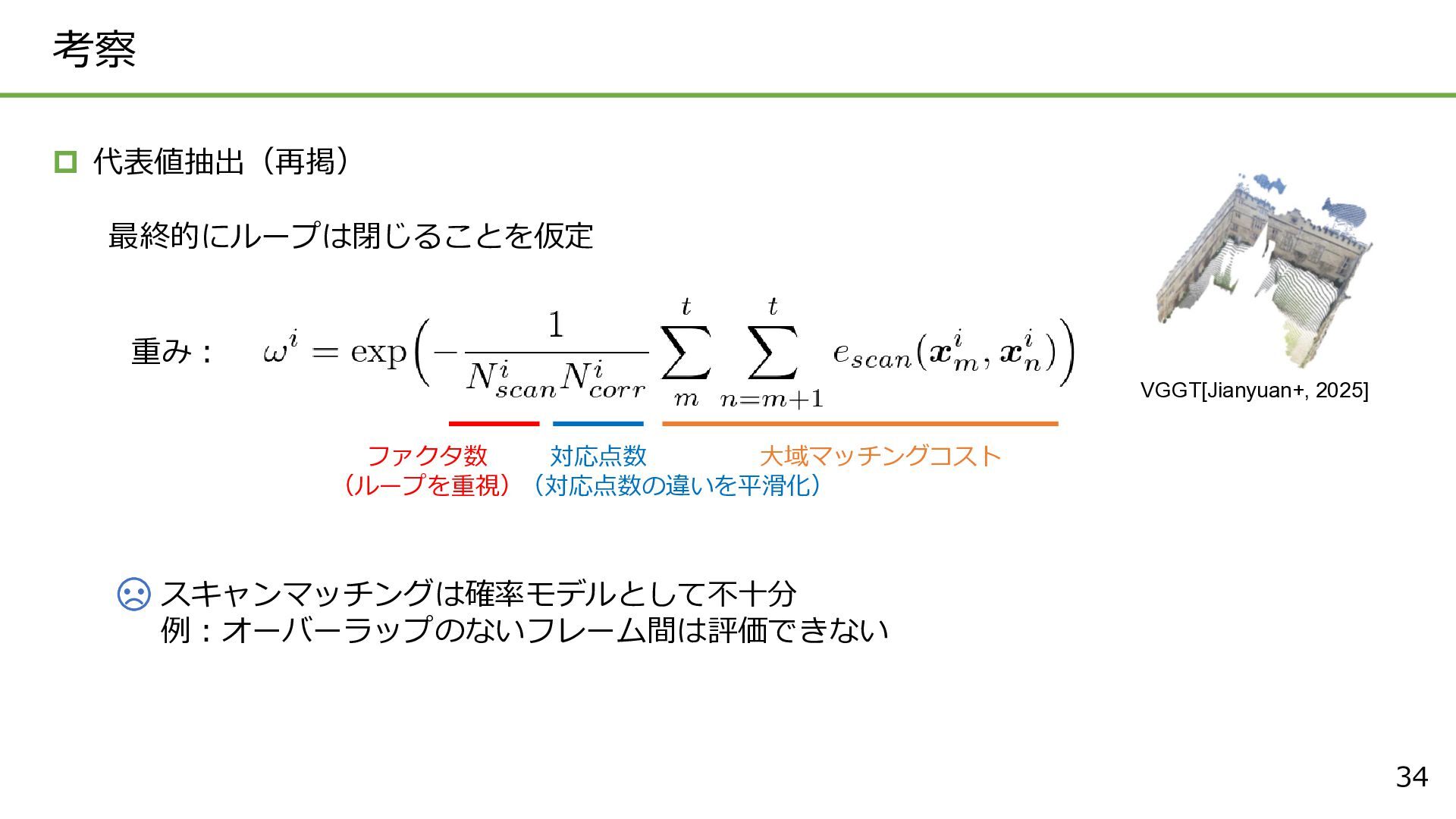 代表値抽出(再掲) VGGT[Jianyuan+, 2025] スキャンマッチングは確率モデルとして不十分 例:オーバーラップのないフレーム間は評価できない