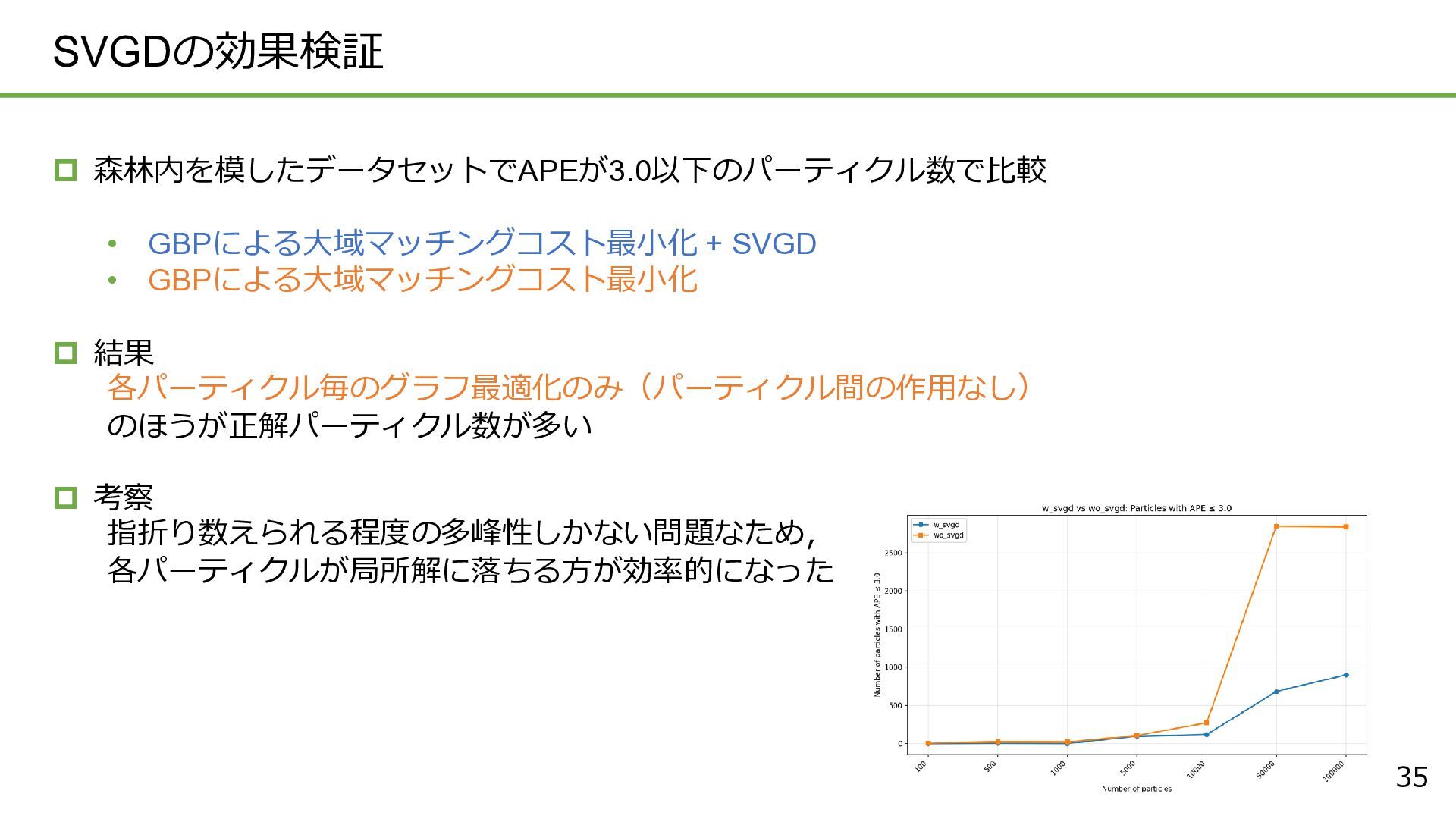 35 SVGDの効果検証 森林内を模したデータセットでAPEが3.0以下のパーティクル数で比較 • GBPによる大域マッチングコスト最小化 + SVGD • GBPによる大域マッチングコスト最小化