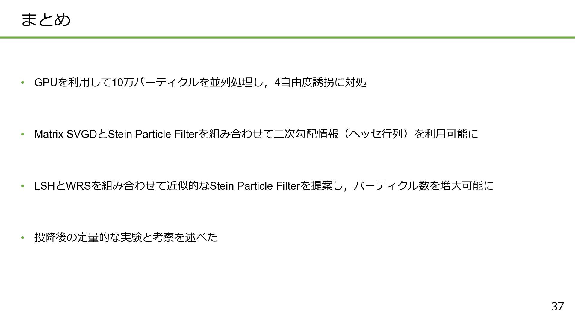 37 まとめ • GPUを利用して10万パーティクルを並列処理し,4自由度誘拐に対処 • Matrix SVGDとStein Particle Filterを組み合わせて二次勾配情報(ヘッセ行列)を利用可能に •