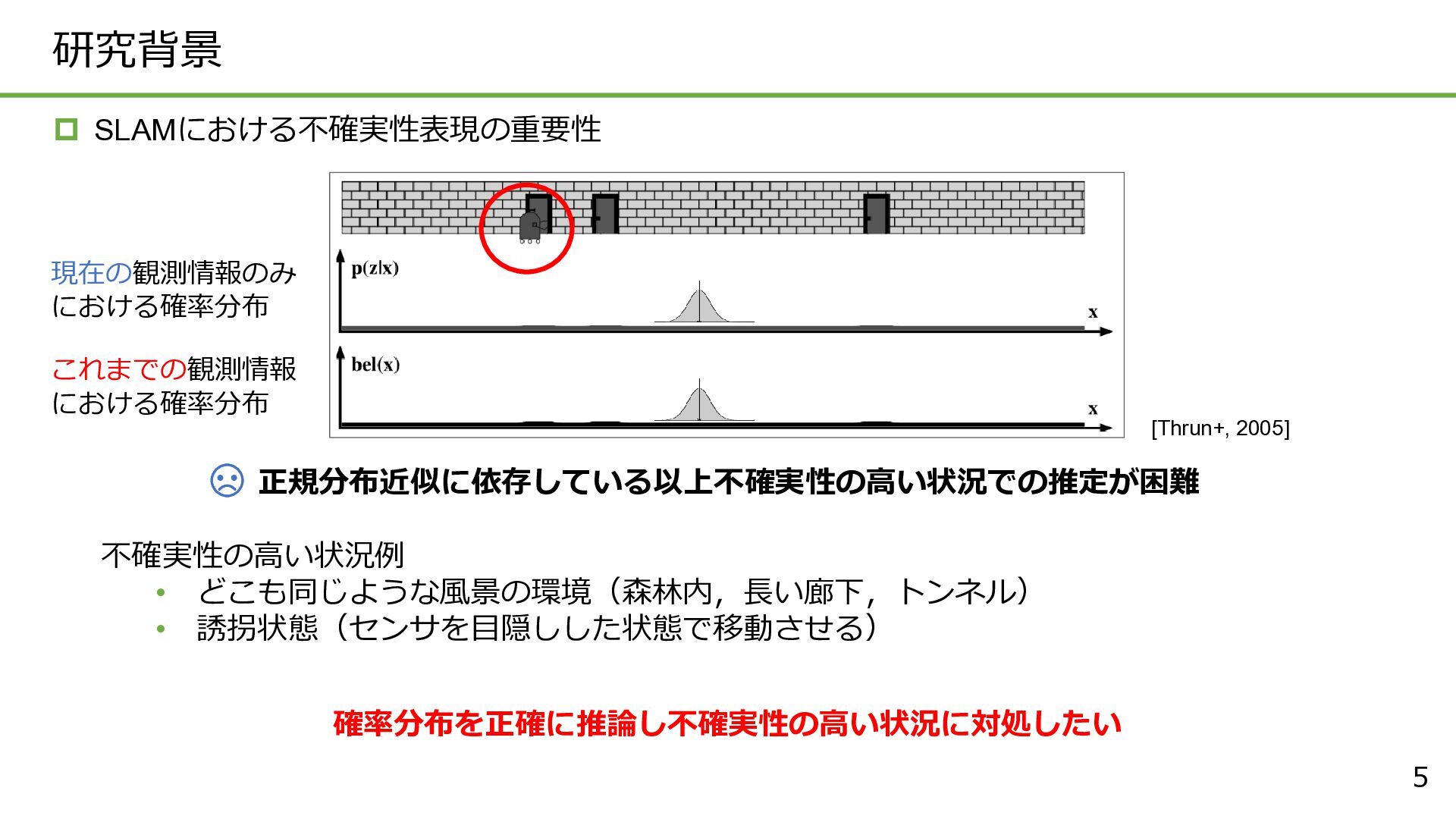 4 研究背景 自己位置推定・SLAMにおける不確実性表現の重要性 [Thrun+, 2005] これまでの観測情報 における確率分布 現在の観測情報のみ における確率分布
