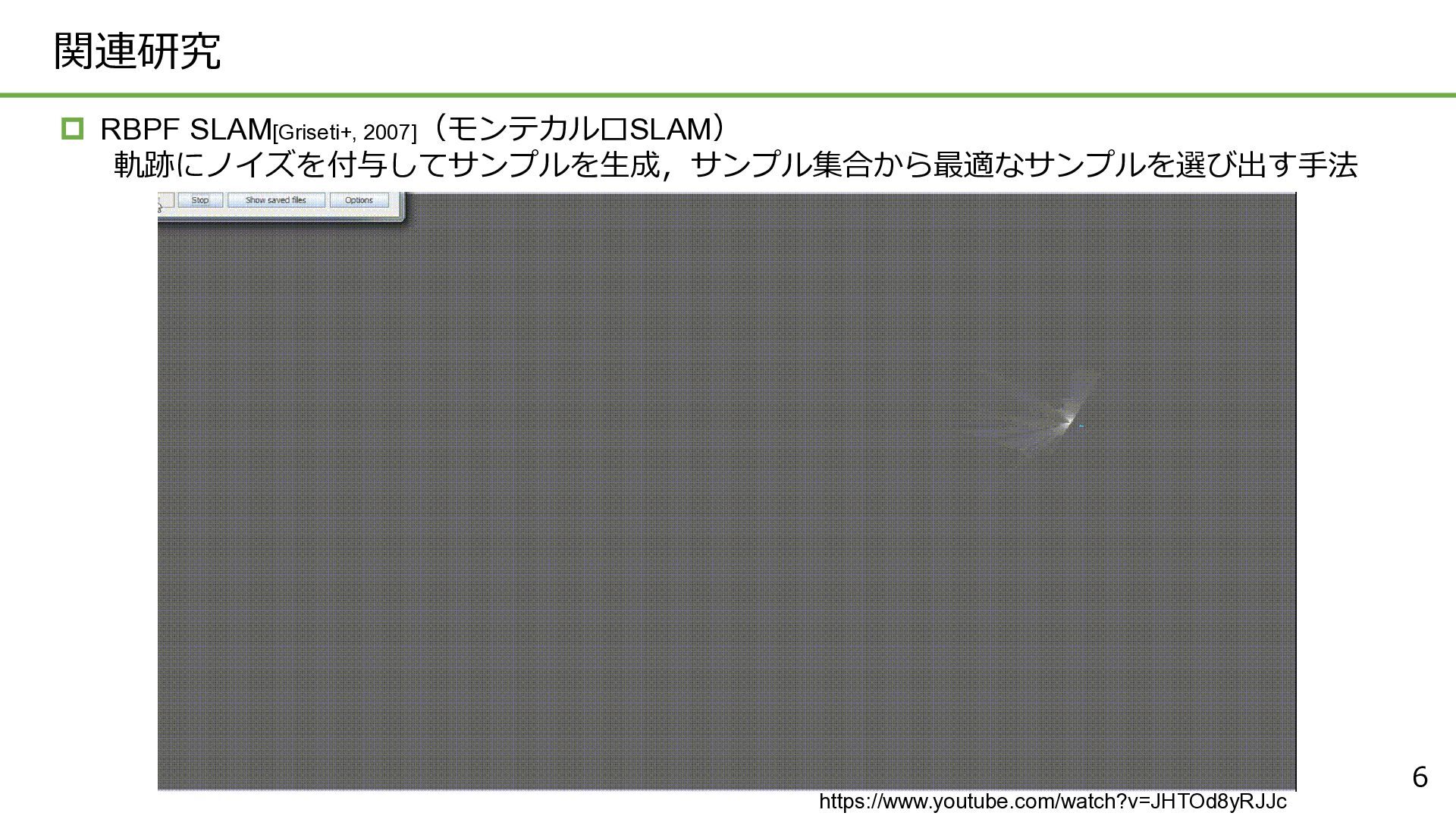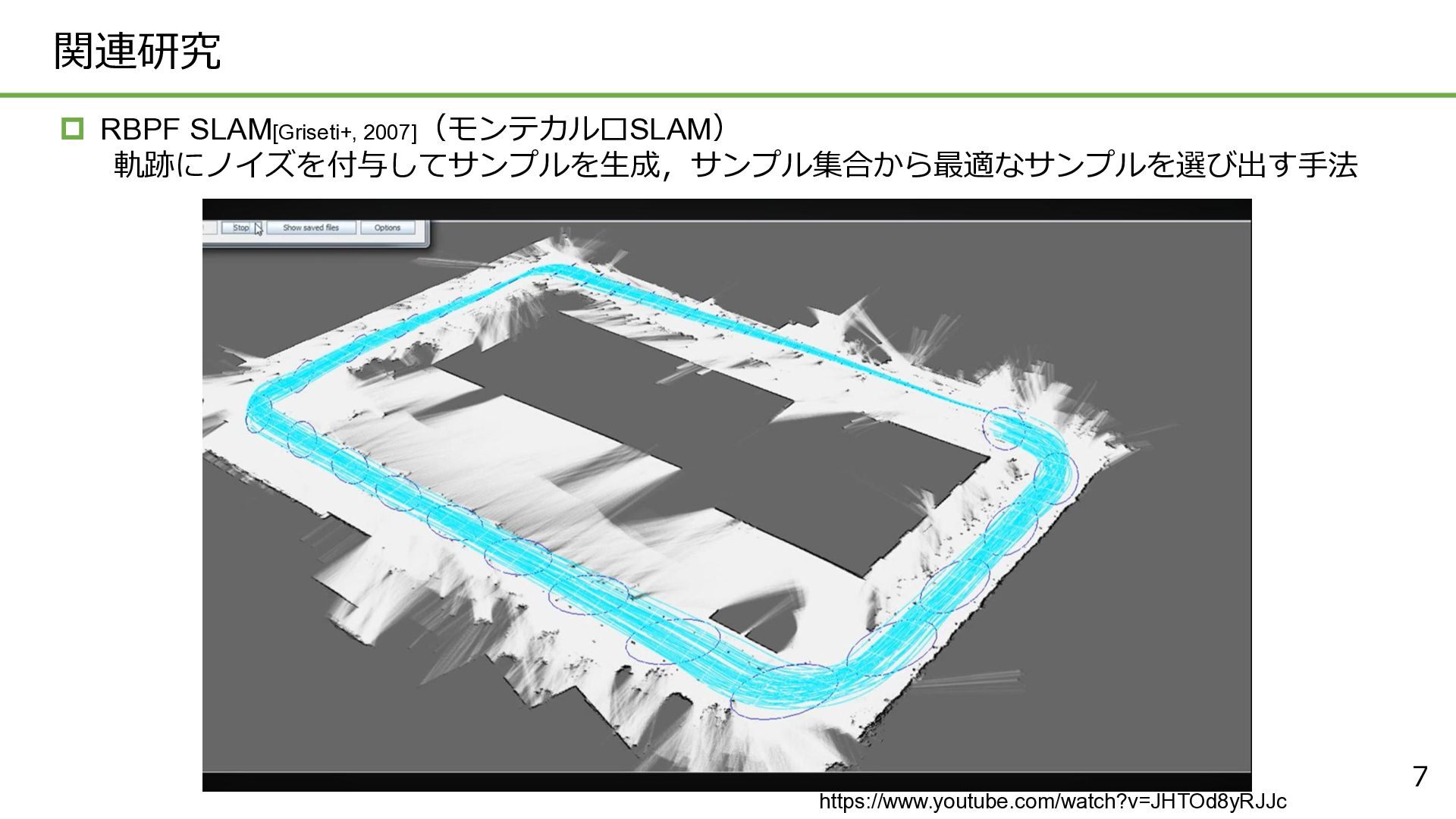 6 関連研究 https://www.youtube.com/watch?v=JHTOd8yRJJc RBPF SLAM[Griseti+, 2007] (モンテカルロSLAM) 軌跡にノイズを付与してサンプルを生成,サンプル集合から最適なサンプルを選び出す手法