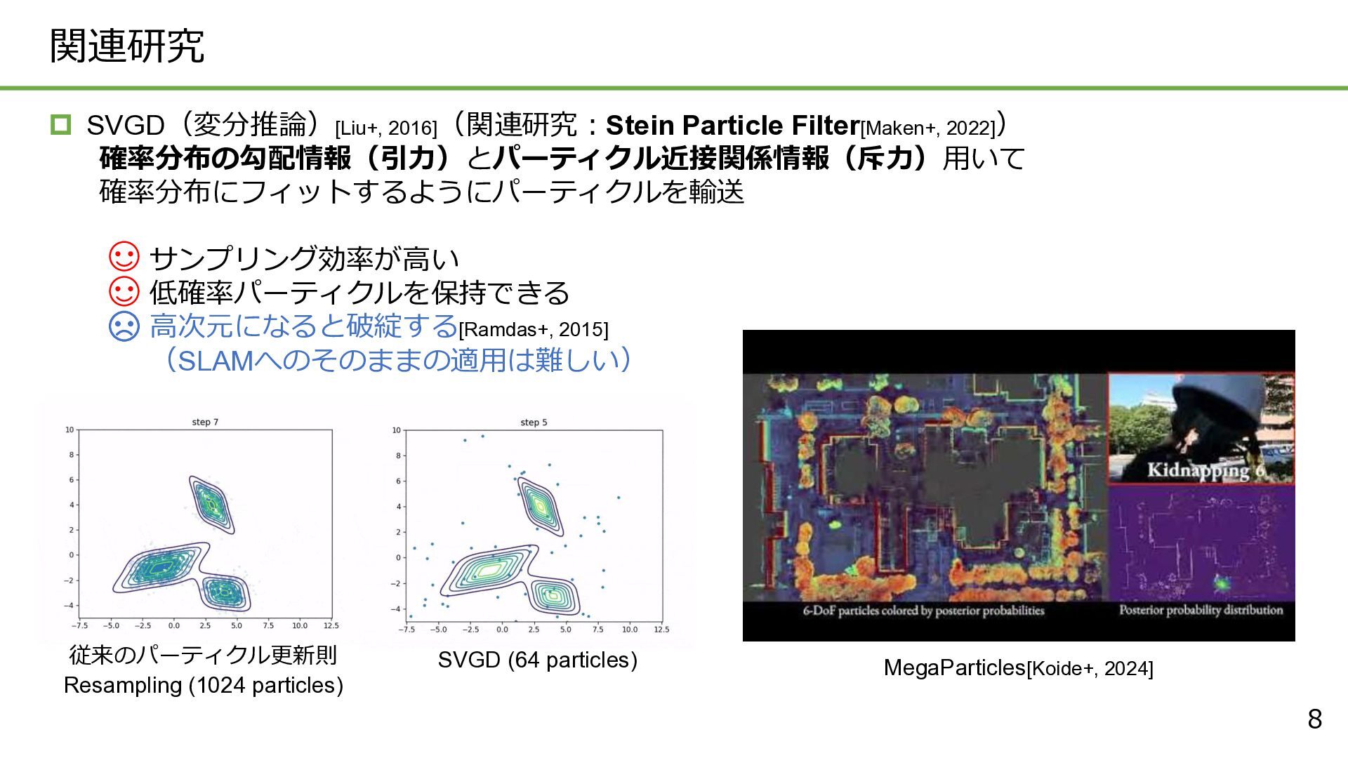 確率分布にフィットするようにパーティクルを輸送 サンプリング効率が高い 低確率パーティクルを保持できる 高次元になると破綻する[Ramdas+, 2015] (SLAMへのそのままの適用は難しい) 関連研究 SVGD (64 particles) 従来のパーティクル更新則 Resampling (1024 particles) MegaParticles[Koide+, 2024]
