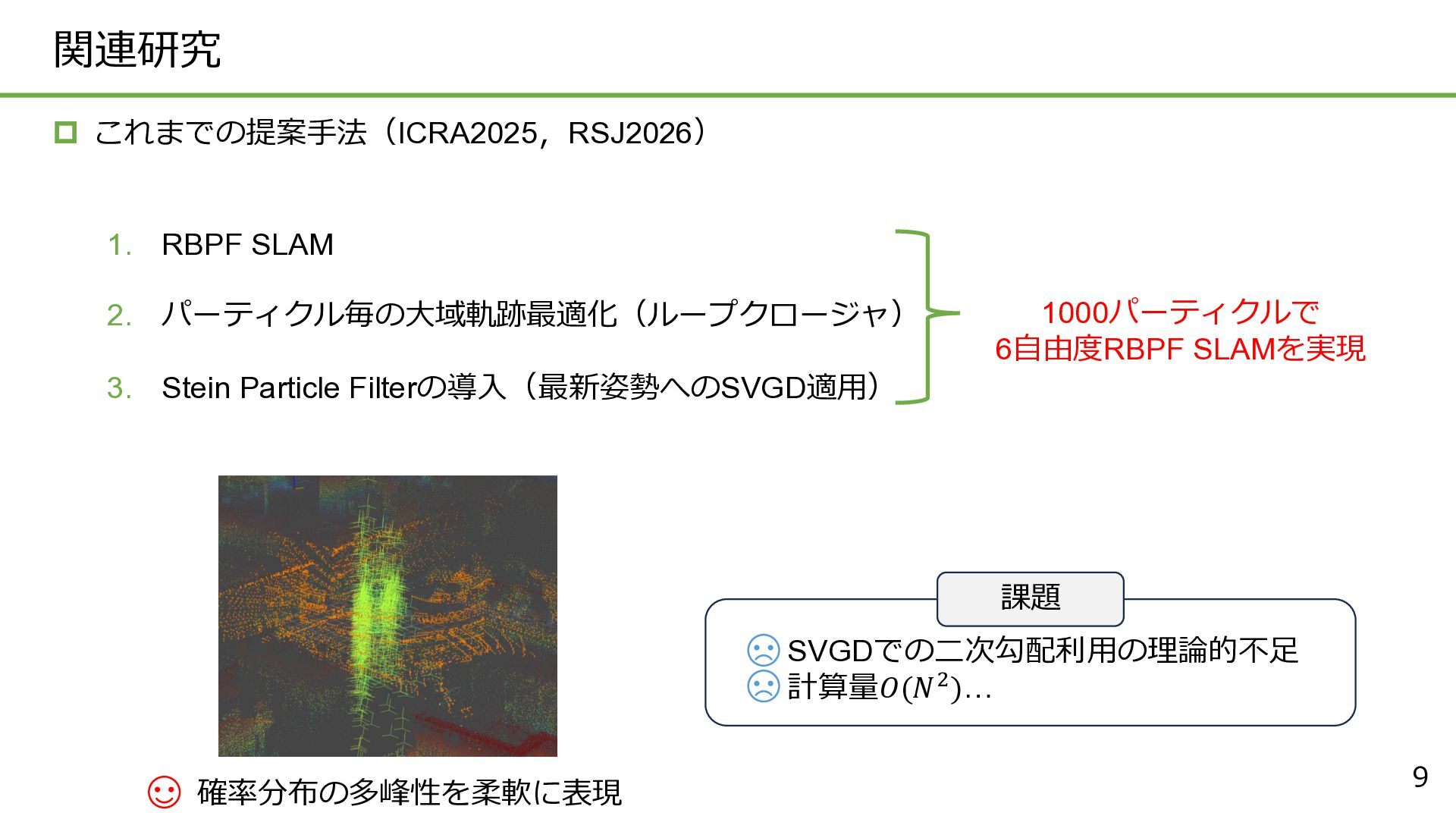 9 関連研究 これまでの提案手法(ICRA2025,RSJ2026) 1. RBPF SLAM 2. パーティクル毎の大域軌跡最適化(ループクロージャ) 3.