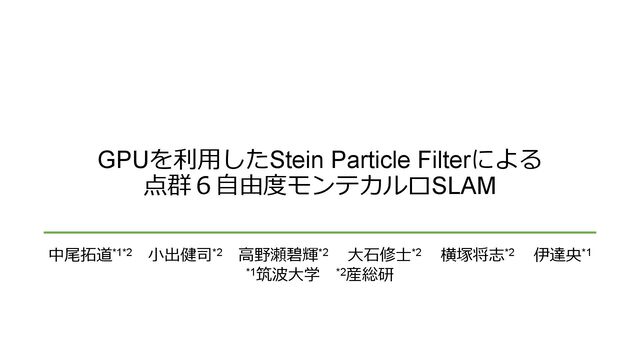 GPUを利用したStein Particle Filterによる 点群6自由度モンテカルロSLAM 中尾拓道*1*2 小出健司*2 高野瀬碧輝*2 大石修士*2 横塚将志*2 伊達央*1