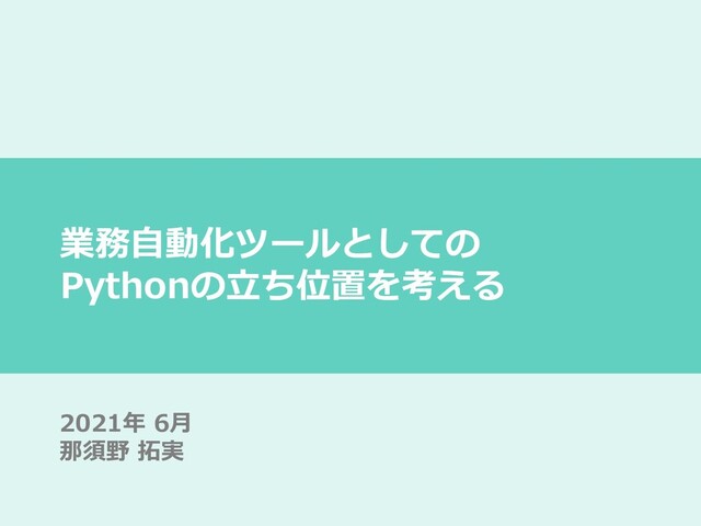 というような方に向けて、業務の自動化ができる手段の全体感を押さえつつPythonの立ち位置をお伝えして、何らかの手段で一歩を踏み出す後押しできればと思います。