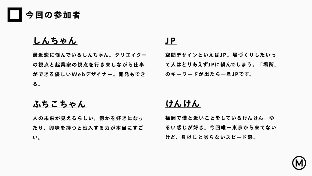 ͠ΜͪΌΜ ࠷ۙ࿀ʹΜͰ͍Δ͠ΜͪΌΜɻΫϦΤΠλʔ ͷࢹͱىۀՈͷࢹΛߦ͖དྷ͠ͳ͕Βࣄ ͕Ͱ͖Δ༏͍͠8FCσβΠφʔɻ։ൃͰ͖ Δɻ ࠓճͷࢀՃऀ ;ͪͪ͜ΌΜ ਓͷະདྷ͕ݟ͑ΔΒ͍͠ɻԿ͔Λ͖ʹͳͬ ͨΓɺڵຯΛ࣋ͭͱೖ͢Δྗ͕ຊʹ͢͝ ͍ɻ
