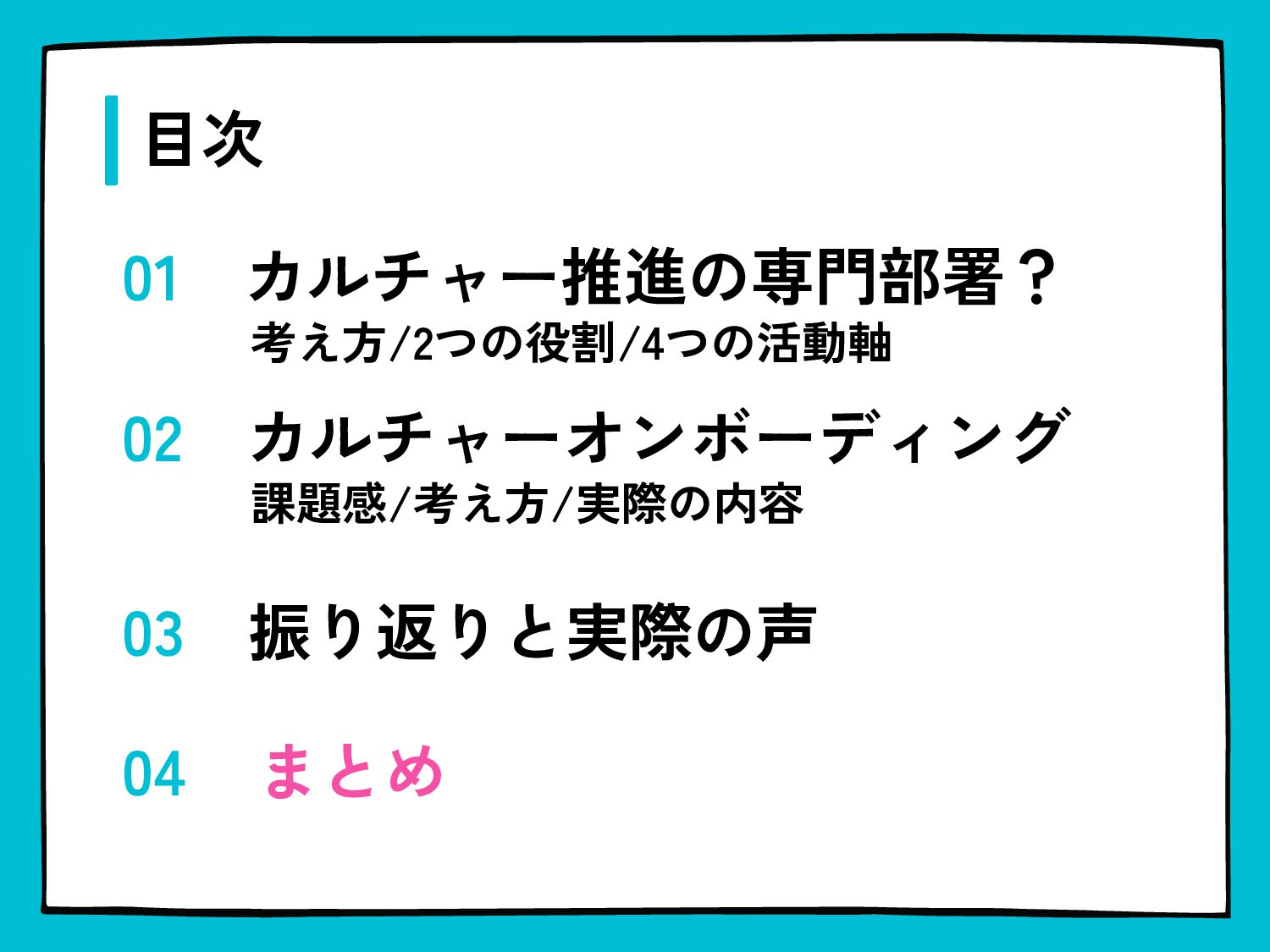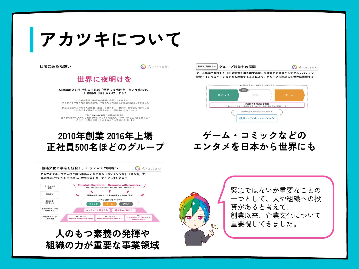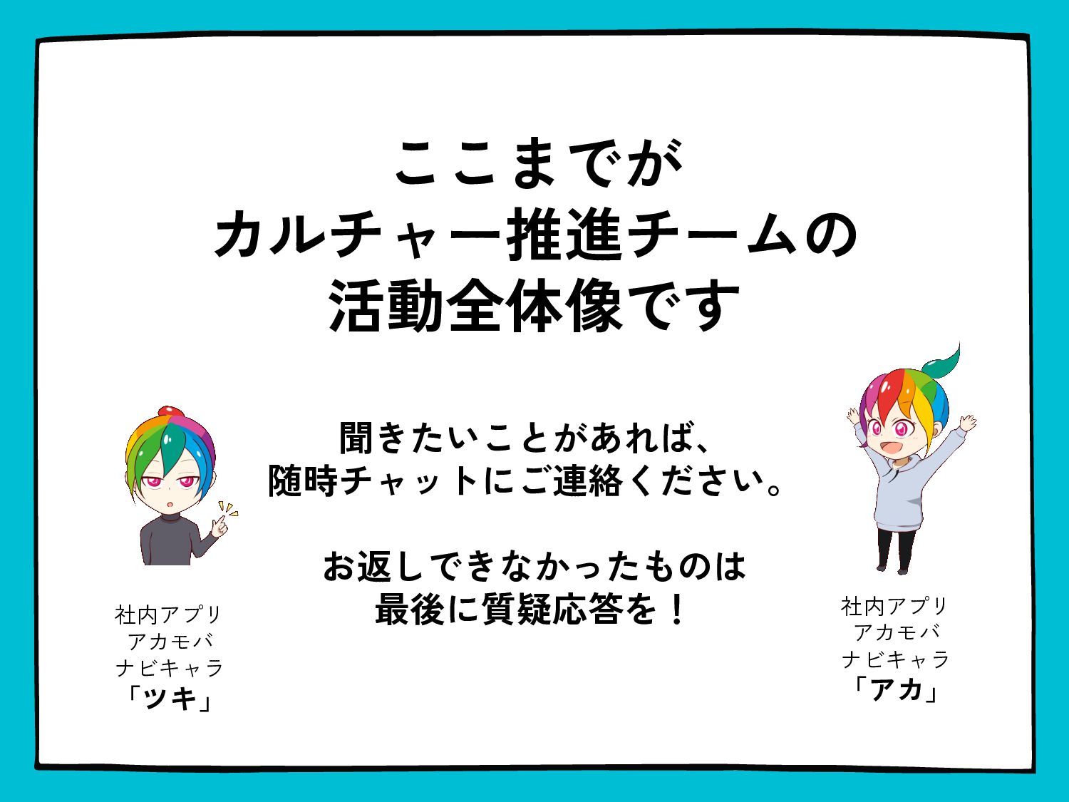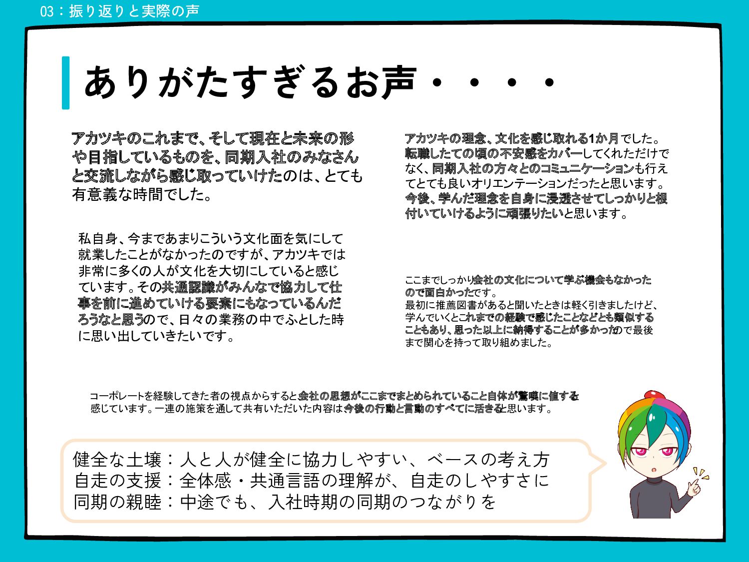 転職したての頃の不安感をカバーしてくれただけで なく、同期入社の方々とのコミュニケーションも行え てとても良いオリエンテーションだったと思います。 今後、学んだ理念を自身に浸透させてしっかりと根 付いていけるように頑張りたいと思います。 私自身、今まであまりこういう文化面を気にして 就業したことがなかったのですが、アカツキでは 非常に多くの人が文化を大切にしていると感じ ています。その共通認識がみんなで協力して仕 事を前に進めていける要素にもなっているんだ ろうなと思うので、日々の業務の中でふとした時 に思い出していきたいです。 ここまでしっかり会社の文化について学ぶ機会もなかった ので面白かったです。 最初に推薦図書があると聞いたときは軽く引きましたけど、 学んでいくとこれまでの経験で感じたことなどとも類似する こともあり、思った以上に納得することが多かった ので最後 まで関心を持って取り組めました。 コーポレートを経験してきた者の視点からすると、 会社の思想がここまでまとめられていること自体が驚嘆に値する と 感じています。一連の施策を通して共有いただいた内容は、 今後の行動と言動のすべてに活きる と思います。