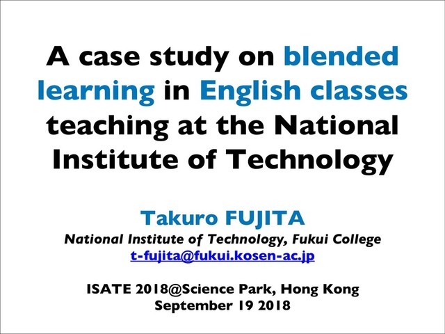 vocabulary exercises • F2F: Form-focused practice (+ input task) + output task Tips • Put every material into one place • Make a shorter video / Try not to make a perfect video / How to deliver a video • Use import functions Thank you for listening Takuro FUJITA [email protected] http://www.takuro-fujita.com A case study on blended learning in English classes teaching at the National Institute of Technology Blended Learning F2F classroom + Web-based Training (WBT)
