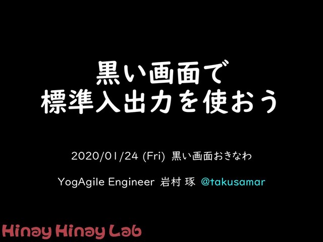 黒い画面で 標準入出力を使おう 2020/01/24 (Fri) 黒い画面おきなわ YogAgile Engineer 岩村 琢 @takusamar