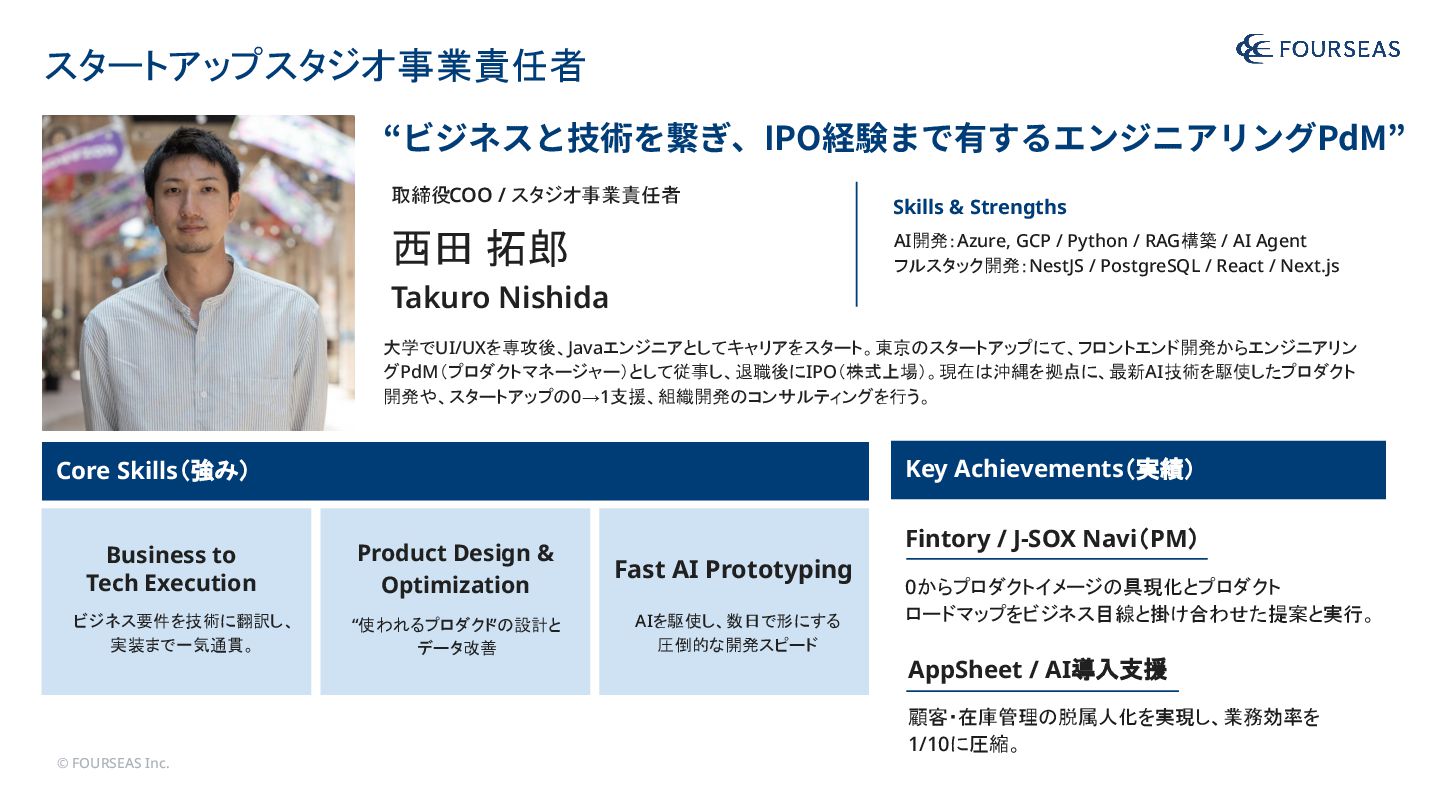 西田 拓郎 Takuro Nishida “ビジネスと技術を繋ぎ、IPO経験まで有するエンジニアリングPdM” 大学でUI/UXを専攻後、Javaエンジニアとしてキャリアをスタート。東京のスタートアップにて、フロントエンド開発からエンジニアリン グPdM(プロダクトマネージャー)として従事し、退職後にIPO(株式上場)。現在は沖縄を拠点に、最新AI技術を駆使したプロダクト 開発や、スタートアップの0→1支援、組織開発のコンサルティングを行う。 AI開発:Azure, GCP / Python / RAG構築 / AI Agent フルスタック開発:NestJS / PostgreSQL / React / Next.js Skills & Strengths Business to Tech Execution ビジネス要件を技術に翻訳し、 実装まで一気通貫。 Fintory / J-SOX Navi(PM) 0からプロダクトイメージの具現化とプロダクト ロードマップをビジネス目線と掛け合わせた提案と実行。 AppSheet / AI導入支援 Product Design & Optimization “使われるプロダクト ”の設計と データ改善 Fast AI Prototyping AIを駆使し、数日で形にする 圧倒的な開発スピード 顧客・在庫管理の脱属人化を実現し、業務効率を 1/10に圧縮。 Core Skills(強み) Key Achievements(実績)