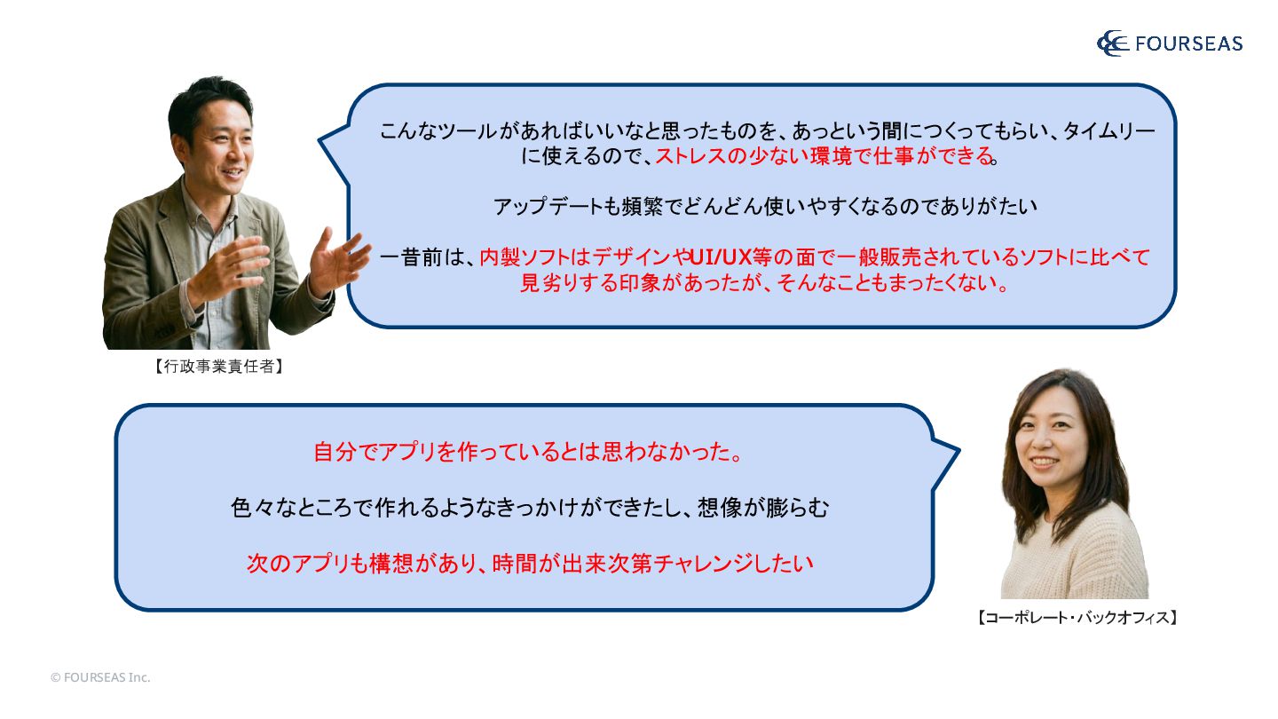 © FOURSEAS Inc. こんなツールがあればいいなと思ったものを、あっという間につくってもらい、タイムリー に使えるので、ストレスの少ない環境で仕事ができる 。 アップデートも頻繁でどんどん使いやすくなるのでありがたい