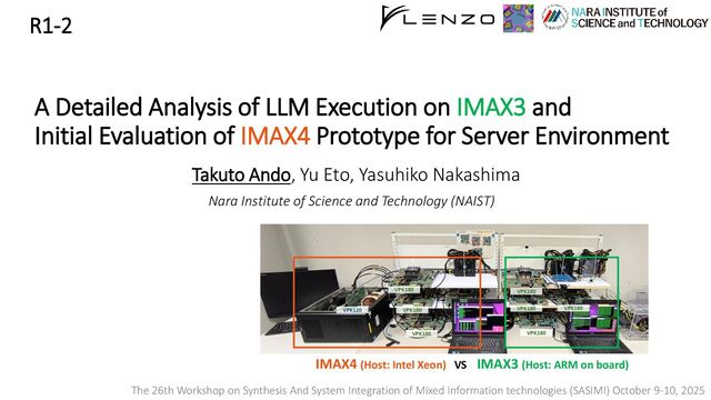 Evaluation of IMAX4 Prototype for Server Environment Takuto Ando, Yu Eto, Yasuhiko Nakashima Nara Institute of Science and Technology (NAIST) The 26th Workshop on Synthesis And System Integration of Mixed Information technologies (SASIMI) October 9-10, 2025 R1-2 VPK180 VPK180 VPK180 VPK180 VPK180 VPK180 VPK180 VPK120 IMAX4 (Host: Intel Xeon) VS IMAX3 (Host: ARM on board)