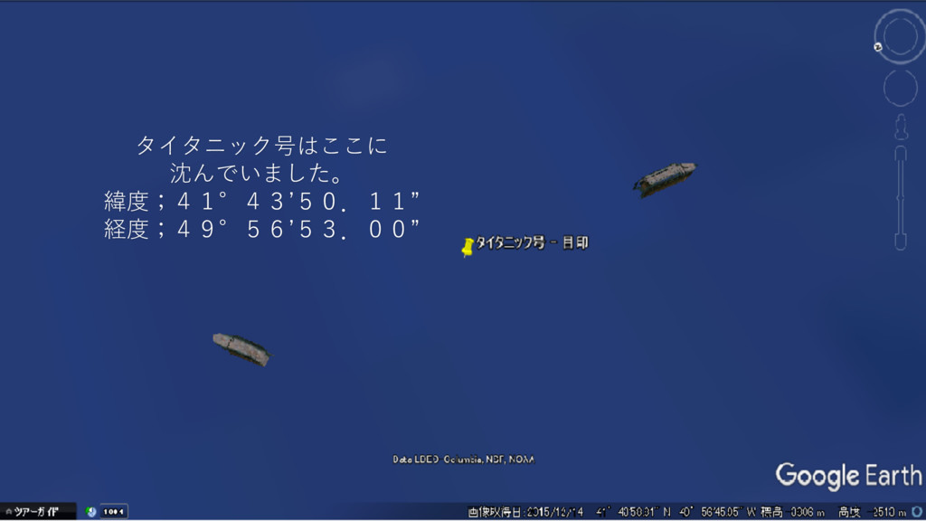 タイタニック号はここに 沈んでいました。 緯度;41°43ʼ50.11” 経度;49°56ʼ53.00”