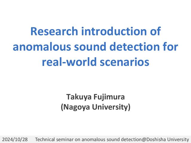 I’ll be talking mainly about my recent work, which has focused on practical challenges. T. Fujimura, K. Imoto, T. Toda, "Discriminative neighborhood smoothing for generative anomalous sound detection," Proc. EUSIPCO, Aug. 2024. [arxiv: https://arxiv.org/abs/2403.11508] T. Fujimura, I. Kuroyanagi, T. Toda, "Improvements of Discriminative Feature Space Training for Anomalous Sound Detection in Unlabeled Conditions,” arXiv e-prints: 2409.09332, 2024. [arxiv: https://arxiv.org/abs/2409.09332]