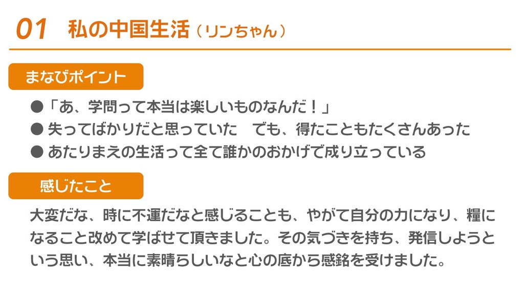 01 ࢲͷதࠃੜ׆ʢϦϯͪΌΜʣ ·ͳͼϙΠϯτ ײͨ͜͡ͱ ˔ʮ͋ɺֶͬͯຊָ͍͠ͷͳΜͩʂʯ ˔ࣦ͔ͬͯΓͩͱࢥ͍ͬͯͨɹͰɺಘͨ͜ͱͨ͘͞Μ͋ͬͨ ˔͋ͨΓ·͑ͷੜ׆ͬͯશͯ୭͔ͷ͓͔͛ͰΓཱ͍ͬͯΔ େมͩͳɺ࣌ʹෆӡͩͳͱײ͡Δ͜ͱɺ͕ͯࣗͷྗʹͳΓɺྐʹ ͳΔ͜ͱվΊֶ͖ͯͤͯ·ͨ͠ɻͦͷؾ͖ͮΛ࣋ͪɺൃ৴͠Α͏ͱ ͍͏ࢥ͍ɺຊʹૉΒ͍͠ͳͱ৺ͷఈ͔ΒײΛड͚·ͨ͠ɻ