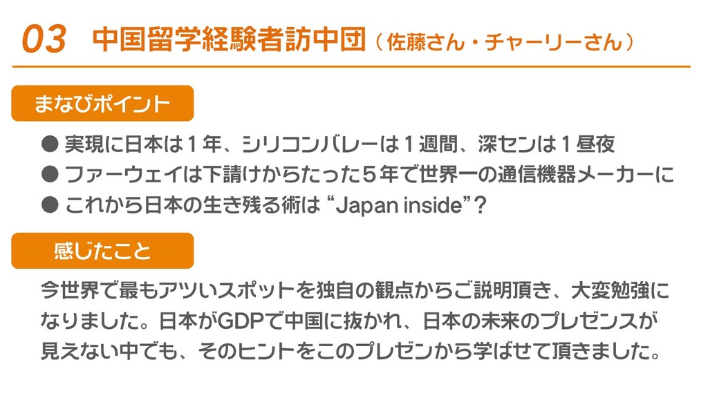 03 தࠃཹֶܦݧऀ๚தஂʢࠤ౻͞ΜɾνϟʔϦʔ͞Μʣ ·ͳͼϙΠϯτ ײͨ͜͡ͱ ˔࣮ݱʹຊ̍ɺγϦίϯόϨʔ̍िؒɺਂηϯ̍ன ˔ϑΝʔΣΠԼ͚͔Βͨͬͨ̑ͰੈքҰͷ௨৴ػثϝʔΧʔʹ ˔͜Ε͔Βຊͷੜ͖Δज़l+BQBOJOTJEFz ࠓੈքͰ࠷Ξπ͍εϙοτΛಠࣗͷ؍͔Β͝આ໌͖ɺେมษڧʹ ͳΓ·ͨ͠ɻຊ͕(%1Ͱதࠃʹൈ͔ΕɺຊͷະདྷͷϓϨθϯε͕