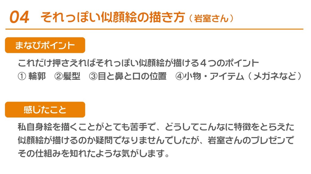 04 ͦΕͬΆ͍ࣅإֆͷඳ͖ํʢؠࣨ͞Μʣ ·ͳͼϙΠϯτ ײͨ͜͡ͱ ͜Ε͚ͩԡ͑͞ΕͦΕͬΆ͍ࣅإֆ͕ඳ͚Δ̐ͭͷϙΠϯτ ᶃྠֲɹᶄܕɹᶅͱඓͱޱͷҐஔɹᶆখɾΞΠςϜʢϝΨωͳͲʣ ࢲࣗֆΛඳ͘͜ͱ͕ͱͯۤखͰɺͲ͏ͯ͜͠ΜͳʹಛΛͱΒ͑ͨ ࣅإֆ͕ඳ͚Δͷ͔ٙͰͳΓ·ͤΜͰ͕ͨ͠ɺؠࣨ͞ΜͷϓϨθϯͰ ͦͷΈΛΕͨΑ͏ͳؾ͕͠·͢ɻ