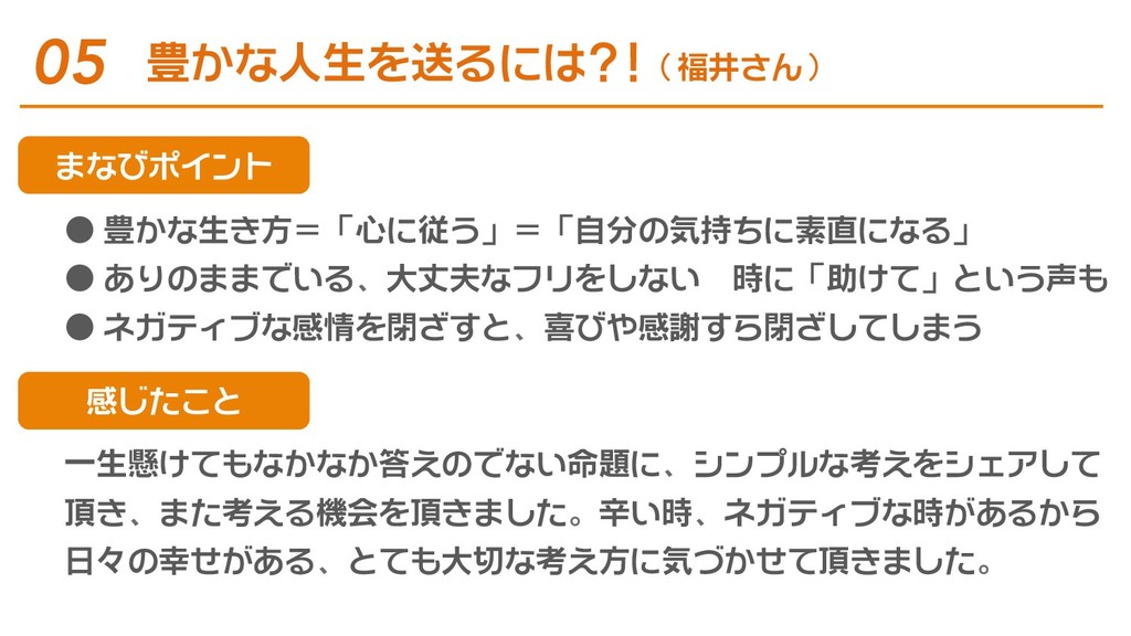 05 ๛͔ͳਓੜΛૹΔʹ ʢҪ͞Μʣ ·ͳͼϙΠϯτ ײͨ͜͡ͱ ˔๛͔ͳੜ͖ํʹʮ৺ʹै͏ʯʹʮࣗͷؾ࣋ͪʹૉʹͳΔʯ ˔͋Γͷ··Ͱ͍ΔɺେৎͳϑϦΛ͠ͳ͍ɹ࣌ʹʮॿ͚ͯʯͱ͍͏ ˔ωΨςΟϒͳײΛด͟͢ͱɺتͼײँ͢Βดͯ͟͠͠·͏ Ұੜݒ͚ͯͳ͔ͳ͔͑ͷͰͳ໋͍ʹɺγϯϓϧͳߟ͑ΛγΣΞͯ͠ ͖ɺ·ͨߟ͑ΔػձΛ͖·ͨ͠ɻਏ͍࣌ɺωΨςΟϒͳ͕࣌͋Δ͔Β