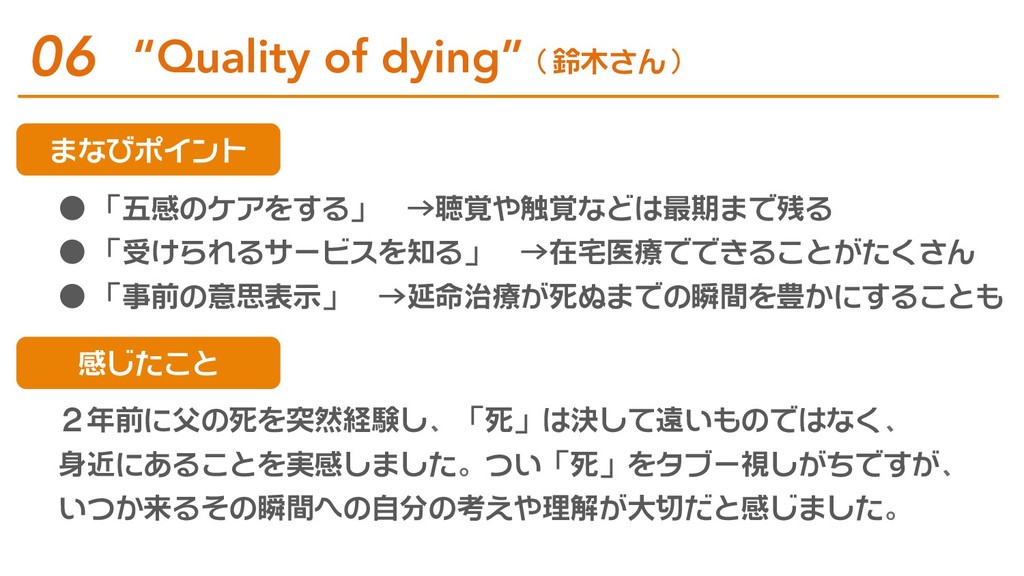 06 “Quality of dying”ʢླ͞Μʣ ·ͳͼϙΠϯτ ײͨ͜͡ͱ ˔ʮޒײͷέΞΛ͢Δʯɹˠௌ֮৮֮ͳͲ࠷ظ·ͰΔ ˔ʮड͚ΒΕΔαʔϏεΛΔʯɹˠࡏҩྍͰͰ͖Δ͜ͱ͕ͨ͘͞Μ ˔ʮࣄલͷҙࢥදࣔʯɹˠԆ໋࣏ྍ͕ࢮ͵·ͰͷॠؒΛ๛͔ʹ͢Δ͜ͱ ̎લʹͷࢮΛಥવܦݧ͠ɺʮࢮʯܾͯ͠ԕ͍ͷͰͳ͘ɺ