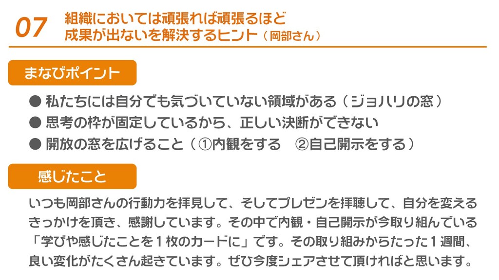 07 ৫ʹ͓͍ͯؤுΕؤுΔ΄Ͳ Ռ͕ग़ͳ͍Λղܾ͢ΔώϯτʢԬ෦͞Μʣ ·ͳͼϙΠϯτ ײͨ͜͡ͱ ˔ࢲͨͪʹࣗͰؾ͍͍ͮͯͳ͍ྖҬ͕͋ΔʢδϣϋϦͷ૭ʣ ˔ࢥߟͷ͕ݻఆ͍ͯ͠Δ͔Βɺਖ਼͍ܾ͠அ͕Ͱ͖ͳ͍ ˔։์ͷ૭Λ͛Δ͜ͱʢᶃ؍Λ͢Δɹᶄࣗݾ։ࣔΛ͢Δʣ ͍ͭԬ෦͞ΜͷߦಈྗΛഈݟͯ͠ɺͦͯ͠ϓϨθϯΛഈௌͯ͠ɺࣗΛม͑Δ ͖͔͚ͬΛ͖ɺײँ͍ͯ͠·͢ɻͦͷதͰ؍ɾࣗݾ։͕ࣔࠓऔΓΜͰ͍Δ