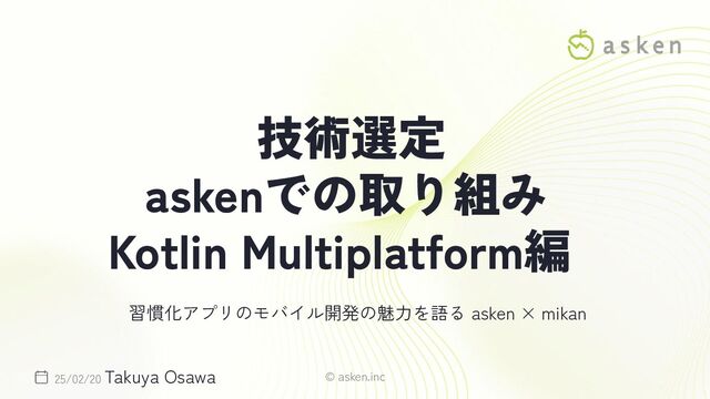 © asken.inc 技術選定 askenでの取り組み Kotlin Multiplatform編 25/02/20 Takuya Osawa 習慣化アプリのモバイル開発の魅力を語る