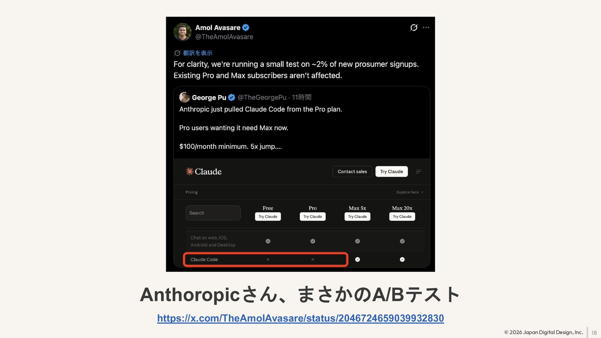 18 © 2026 Japan Digital Design, Inc. Anthoropicさん、まさかのA/Bテスト https://x.com/TheAmolAvasare/status/2046724659039932830