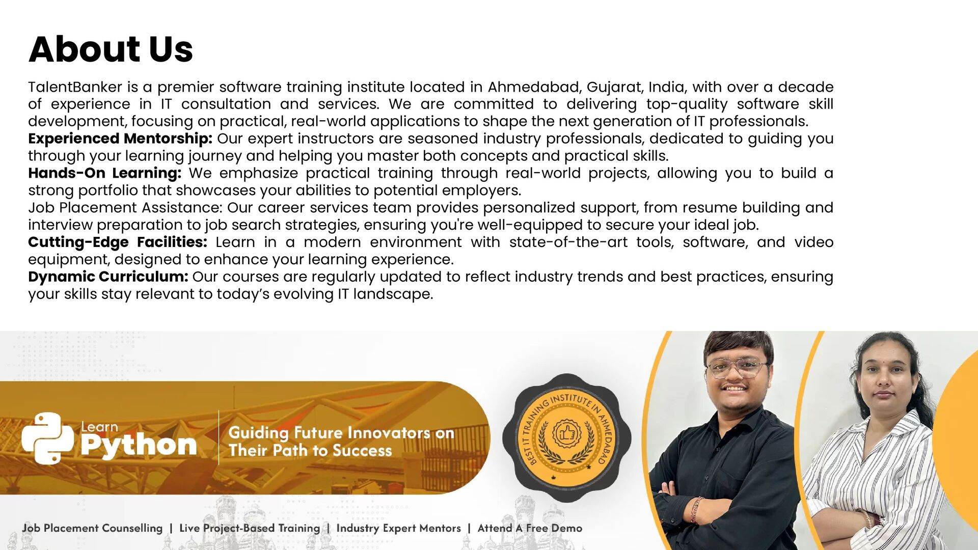 Enroll today at TalentBanker and take your first step towards mastering Python. For more information, visit our landing page: TalentBanker Python Training Institute in Ahmedabad.