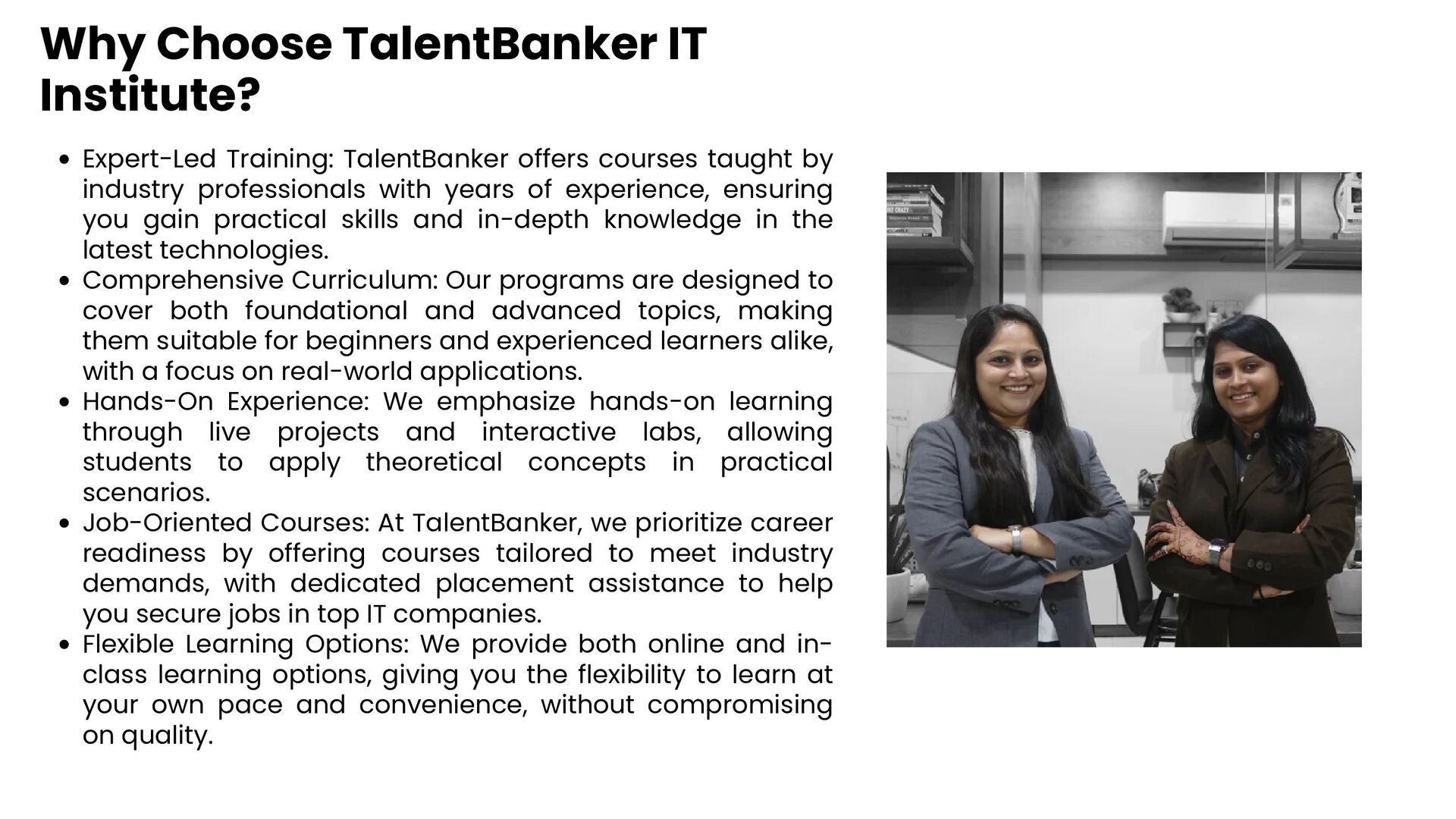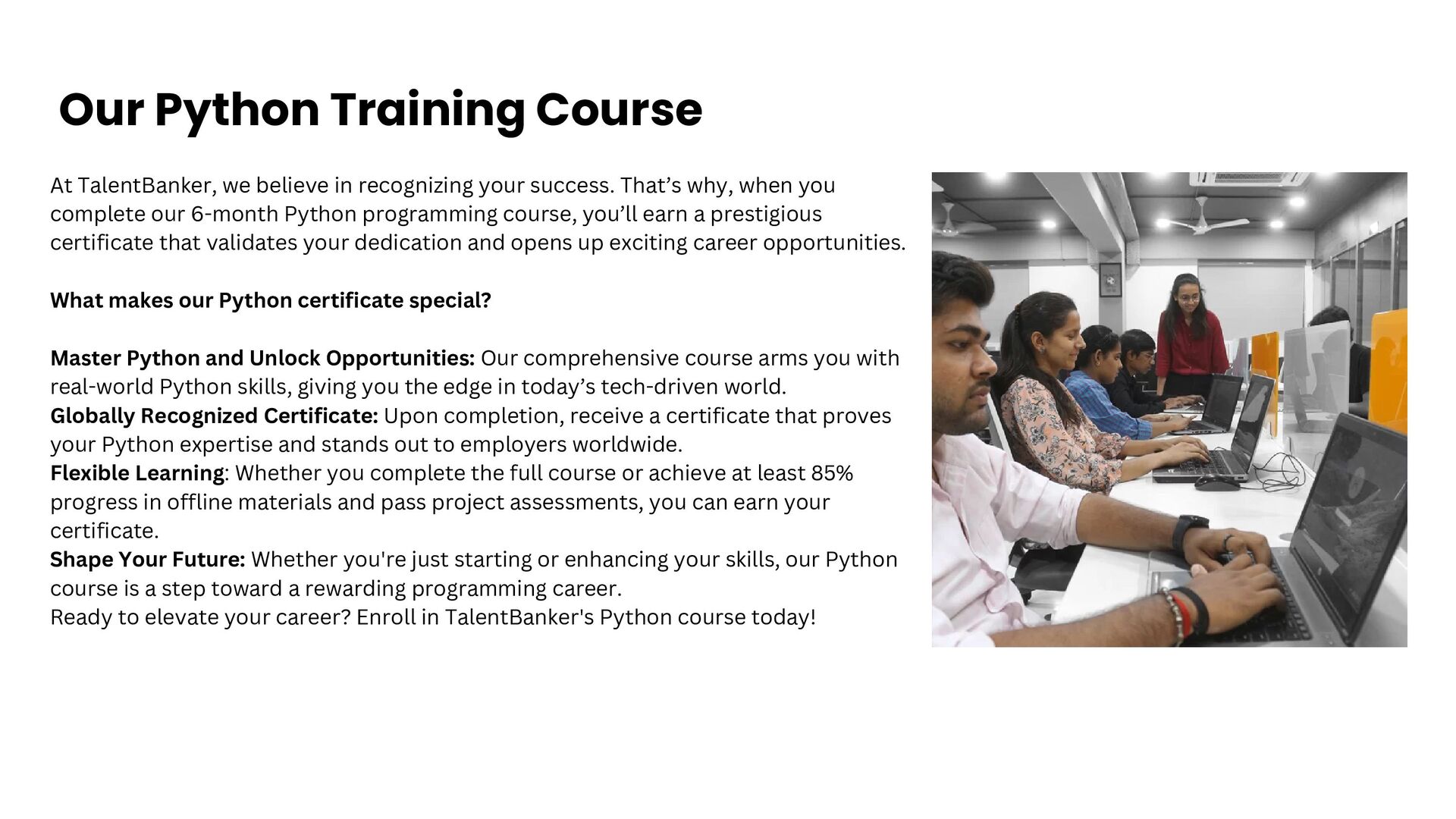 At TalentBanker, we offer a well-structured curriculum that covers everything from Python basics to advanced programming concepts. Our training includes real-world projects, industry-relevant techniques, and personalized mentoring to ensure you master Python and build a solid foundation for a successful tech career.