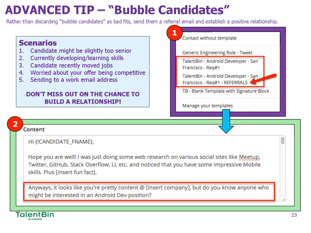 not only saves hours of time, but drastically boosts your response rates by repeatedly nudging candidates. • Achieve 2x – 5x greater open, click, & response rates by auto-sending follow ups = more candidates in your funnel = more hires! • Over 80% responses come from 2nd, 3rd, and 4th messages! (Automated) Persistence pays. *Case study executed by TalentBin Product Specialist (TJ) using TalentBin to recruit passive candidates. 82% 63%