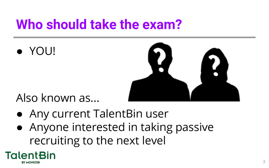 What does TalentBin Certified mean? • Why get certified? • How to study for the exam • When to take the exam • Where to take the exam • Exam topics and review 2