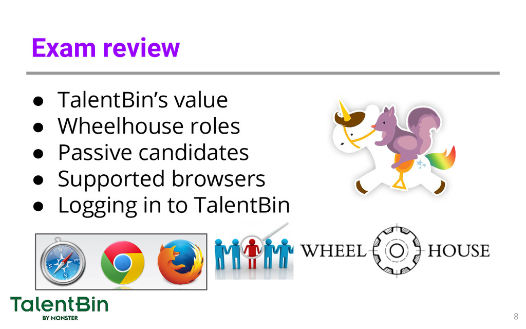 online! ◦ TalentBin support ◦ Also, after this webinar • Take the exam as many times as you want 7