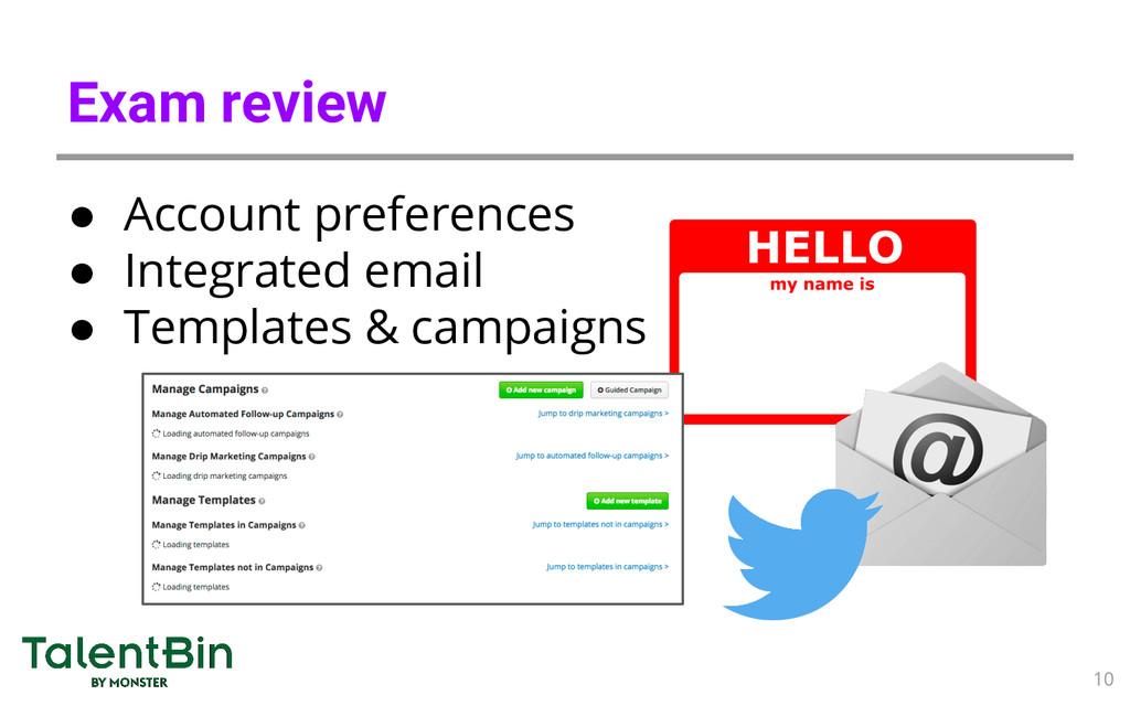 Mailbox • Reporting • Dashboard • Sourcing ◦ Folders ◦ Searches ◦ Saving searches ◦ Naming conventions ◦ Filters ◦ TalentBin icons Exam review 11