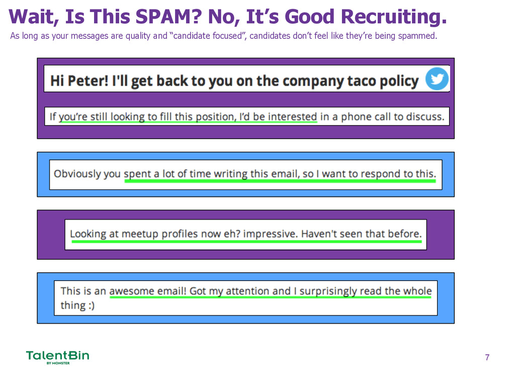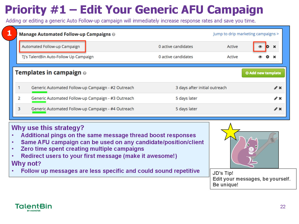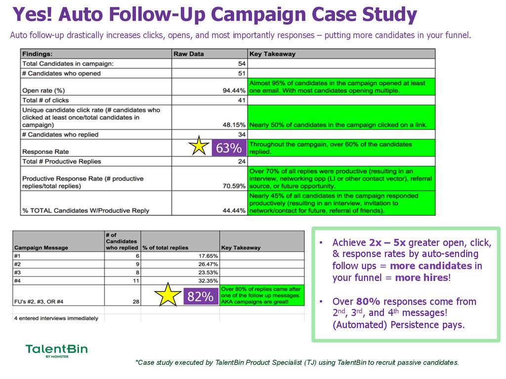 If you aren't using TalentBin Automated Follow-up campaigns, you're missing out on 80% of potential candidate replies. TJ (the presenter) achieved a 65% response rate in his last campaign.