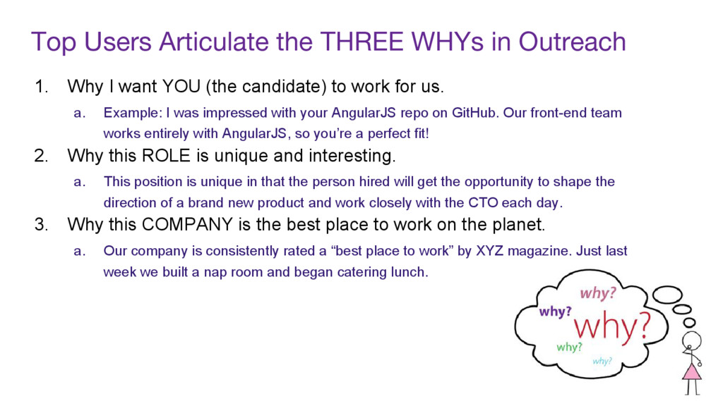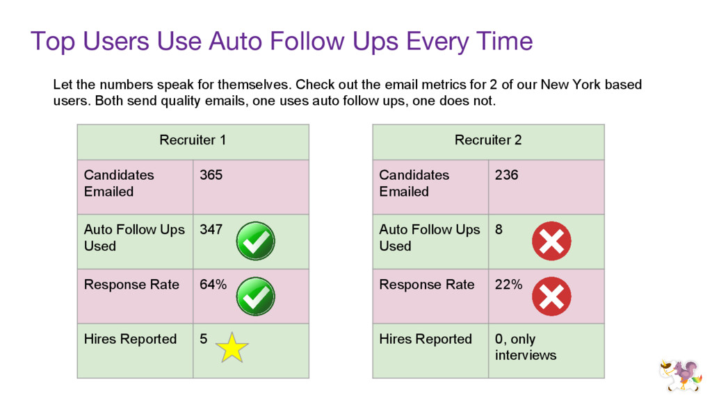 Follow Up #1 a. “And if company awards and catered lunches didn’t spark your interest, I think you’ll be excited to know that we offer flexible work schedules. Big sleeper? Come in at 10 AM! 2. Follow Up #2 a. “Okay so maybe you’re an early bird that loves working long hours… Each team member is in charge of their own projects and deliverables, you won’t have someone watching over your shoulder and micromanaging.” 3. Follow Up #3 a. “You’re making this tough on me, not a problem! I’m happy to work for top talent. We’ll also give you $10,000 to customize your workspace. One of our developers built a desk inside a model spaceship, so she really took “work SPACE” to heart :). What will you build?”
