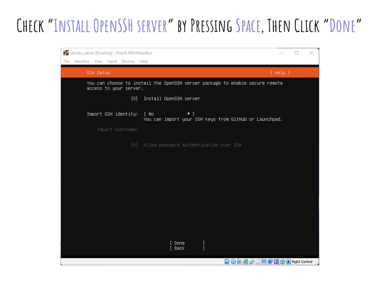 Check “Install OpenSSH server” by Pressing Space, Then Click “Done”