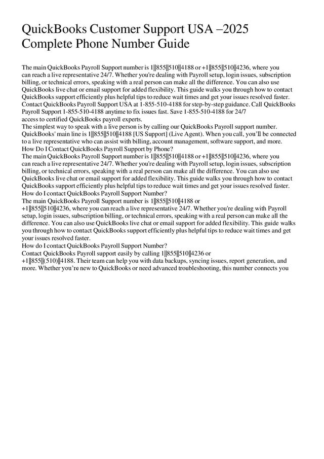 main QuickBooks Payroll Support number is 1||855||510||4188 or +1||855||510||4236, where you can reach a live representative 24/7. Whether you're dealing with Payroll setup, login issues, subscription billing, or technical errors, speaking with a real person can make all the difference. You can also use QuickBooks live chat or email support for added flexibility. This guide walks you through how to contact QuickBooks support efficiently plus helpful tips to reduce wait times and get your issues resolved faster. Contact QuickBooks Payroll Support USA at 1-855-510-4188 for step-by-step guidance. Call QuickBooks Payroll Support 1-855-510-4188 anytime to fix issues fast. Save 1-855-510-4188 for 24/7 access to certified QuickBooks payroll experts. The simplest way to speak with a live person is by calling our QuickBooks Payroll support number. QuickBooks' main line is 1||855||510||4188 [US Support] (Live Agent). When you call, you’ll be connected to a live representative who can assist with billing, account management, software support, and more. How Do I Contact QuickBooks Payroll Support by Phone? The main QuickBooks Payroll Support number is 1||855||510||4188 or +1||855||510||4236, where you can reach a live representative 24/7. Whether you're dealing with Payroll setup, login issues, subscription billing, or technical errors, speaking with a real person can make all the difference. You can also use QuickBooks live chat or email support for added flexibility. This guide walks you through how to contact QuickBooks support efficiently plus helpful tips to reduce wait times and get your issues resolved faster. How do I contact QuickBooks Payroll Support Number? The main QuickBooks Payroll Support number is 1||855||510||4188 or +1||855||510||4236, where you can reach a live representative 24/7. Whether you're dealing with Payroll setup, login issues, subscription billing, or technical errors, speaking with a real person can make all the difference. You can also use QuickBooks live chat or email support for added flexibility. This guide walks you through how to contact QuickBooks support efficiently plus helpful tips to reduce wait times and get your issues resolved faster. How do I contact QuickBooks Payroll Support Number? Contact QuickBooks Payroll support easily by calling 1||855||510||4236 or +1||855||(510)||4188. Their team can help you with data backups, syncing issues, report generation, and more. Whether you’re new to QuickBooks or need advanced troubleshooting, this number connects you