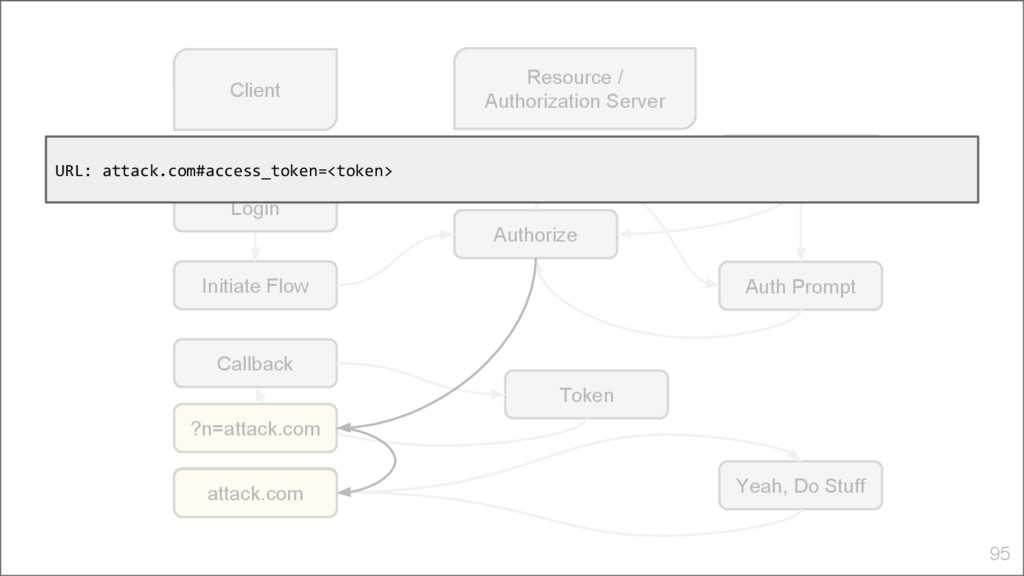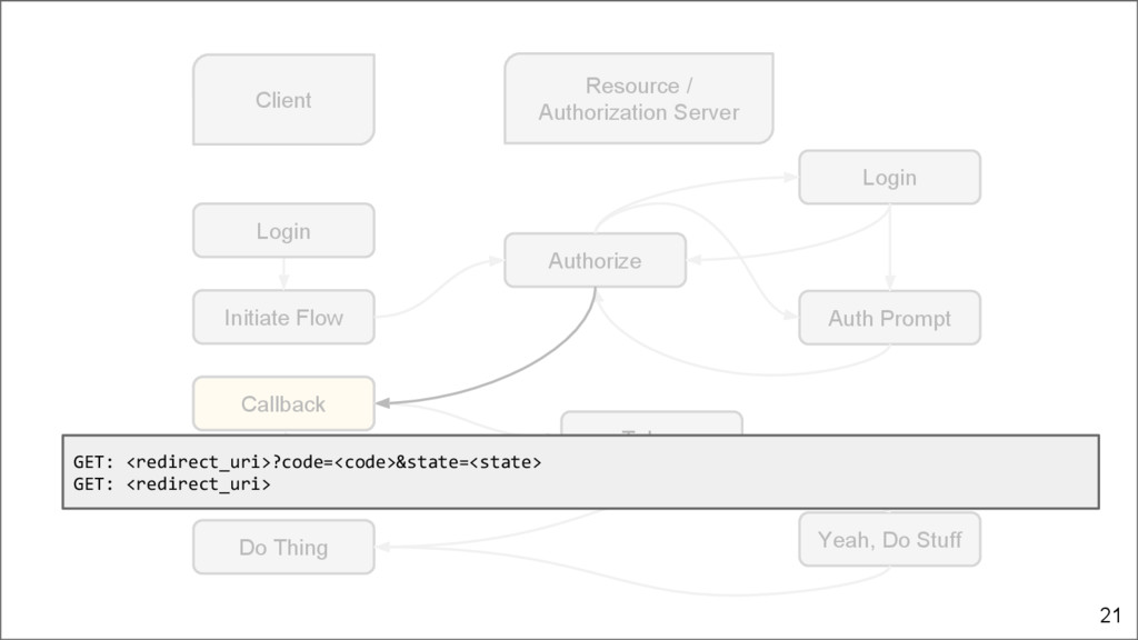 to authenticate to receive an access_token ◦ URL parameter, browser sends to redirect_url #access_token used directly ◦ URL hash, browser does not send to redirect_url ◦ parsed with javascript 20