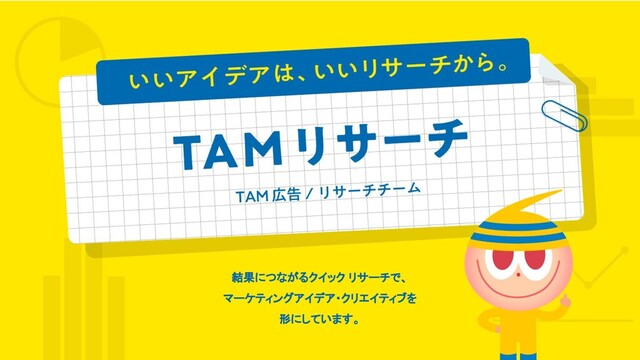 いいアイデアは、いいリサーチから。クリエイティブ・テックエージェンシーTAM 広告/リサーチチームの、結果につながるクイックリサーチで、マーケティングアイデア・クリエイティブを形にするサービス紹介スライドです。