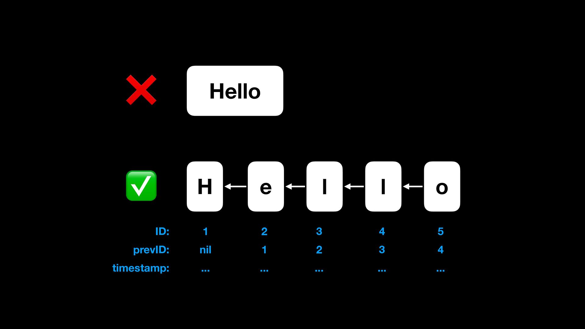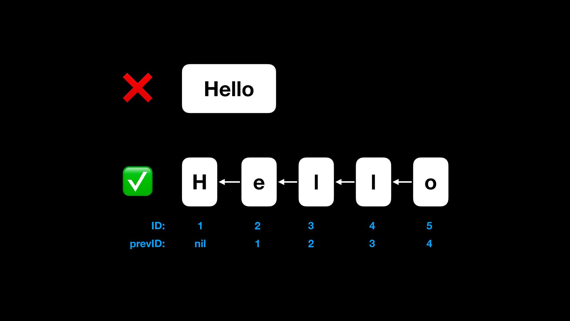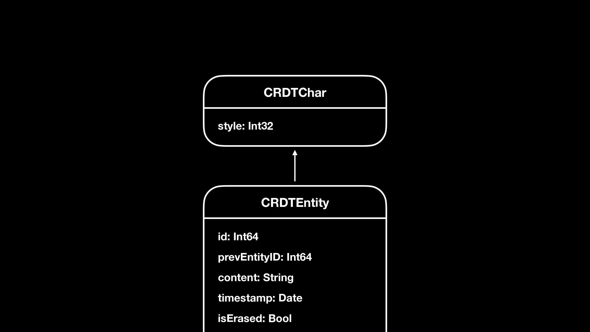 CRDTChar style: Int32 CRDTEntity id: Int64 prevEntityID: Int64 content: String