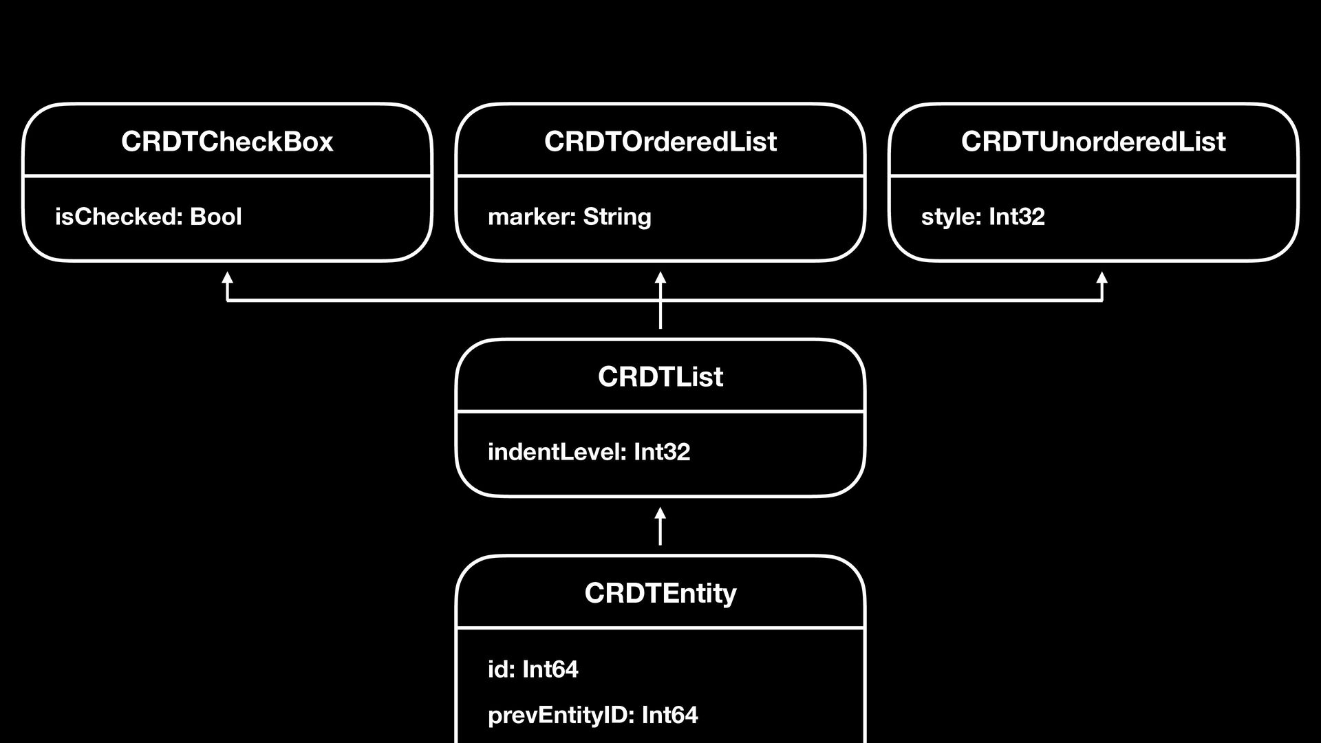 CRDTList indentLevel: Int32 CRDTEntity id: Int64 prevEntityID: Int64 CRDTCheckBox isChecked: